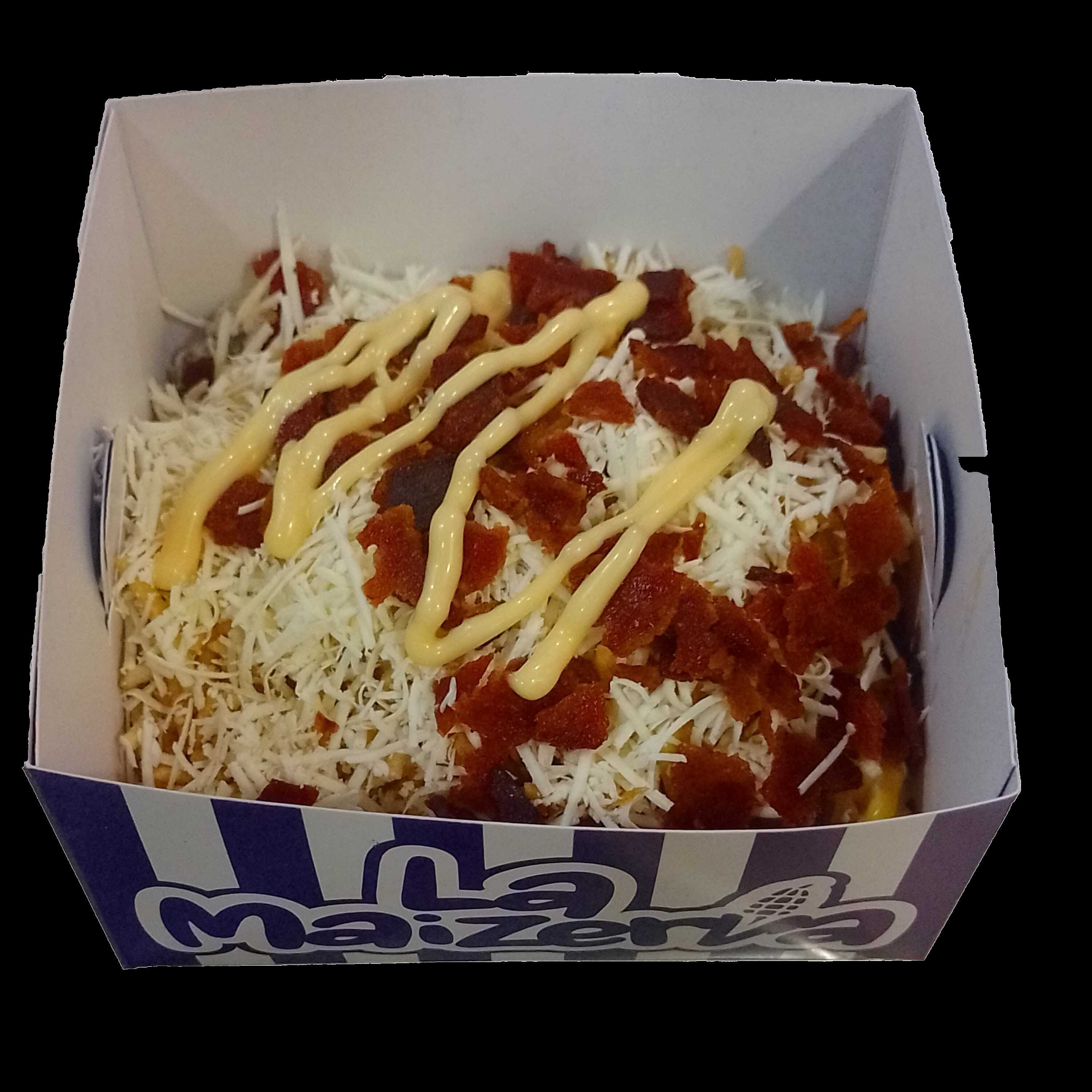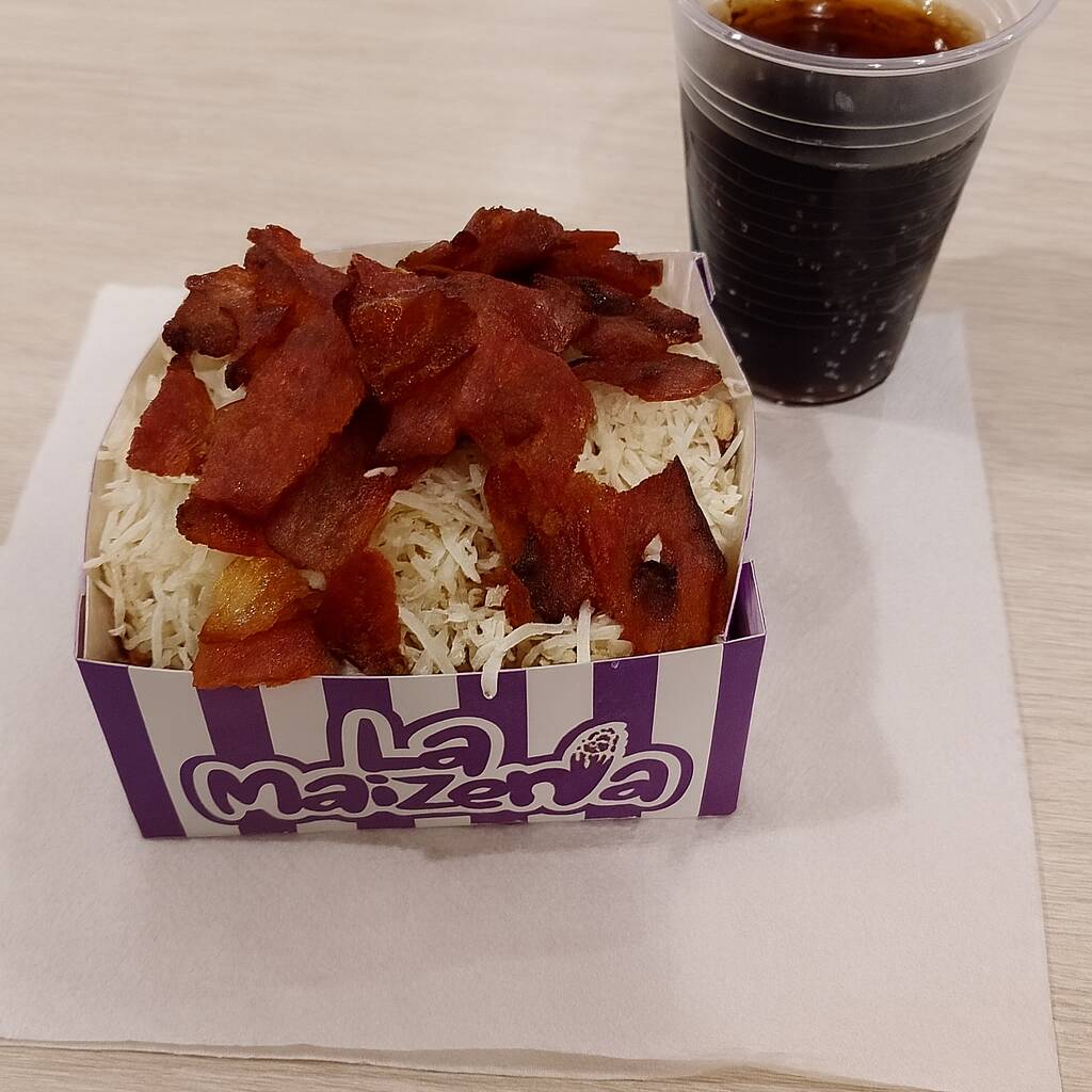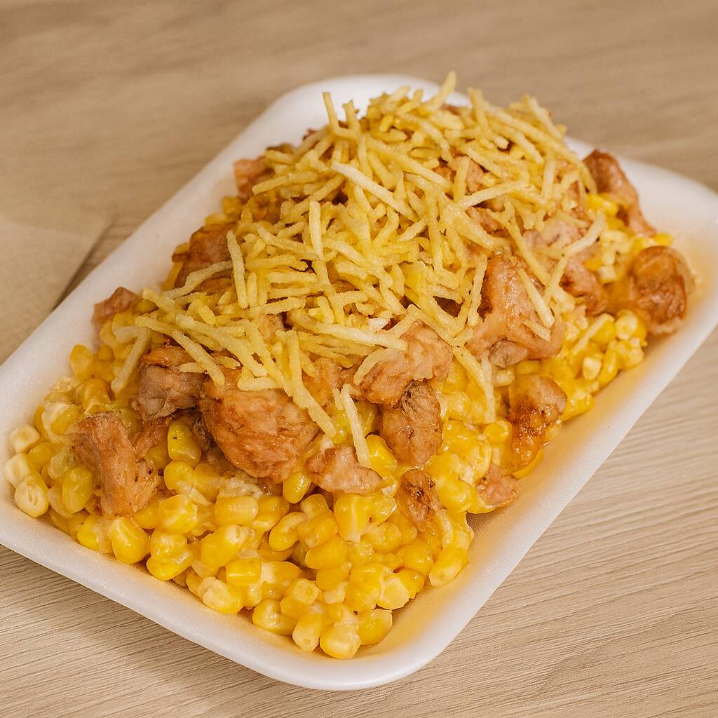 Bandeja con 300g de maíz dulce, papa chongo, queso crema, queso costeño, salsa maíz dulce, salsa de la casa y 100 g de pollo en trocito.