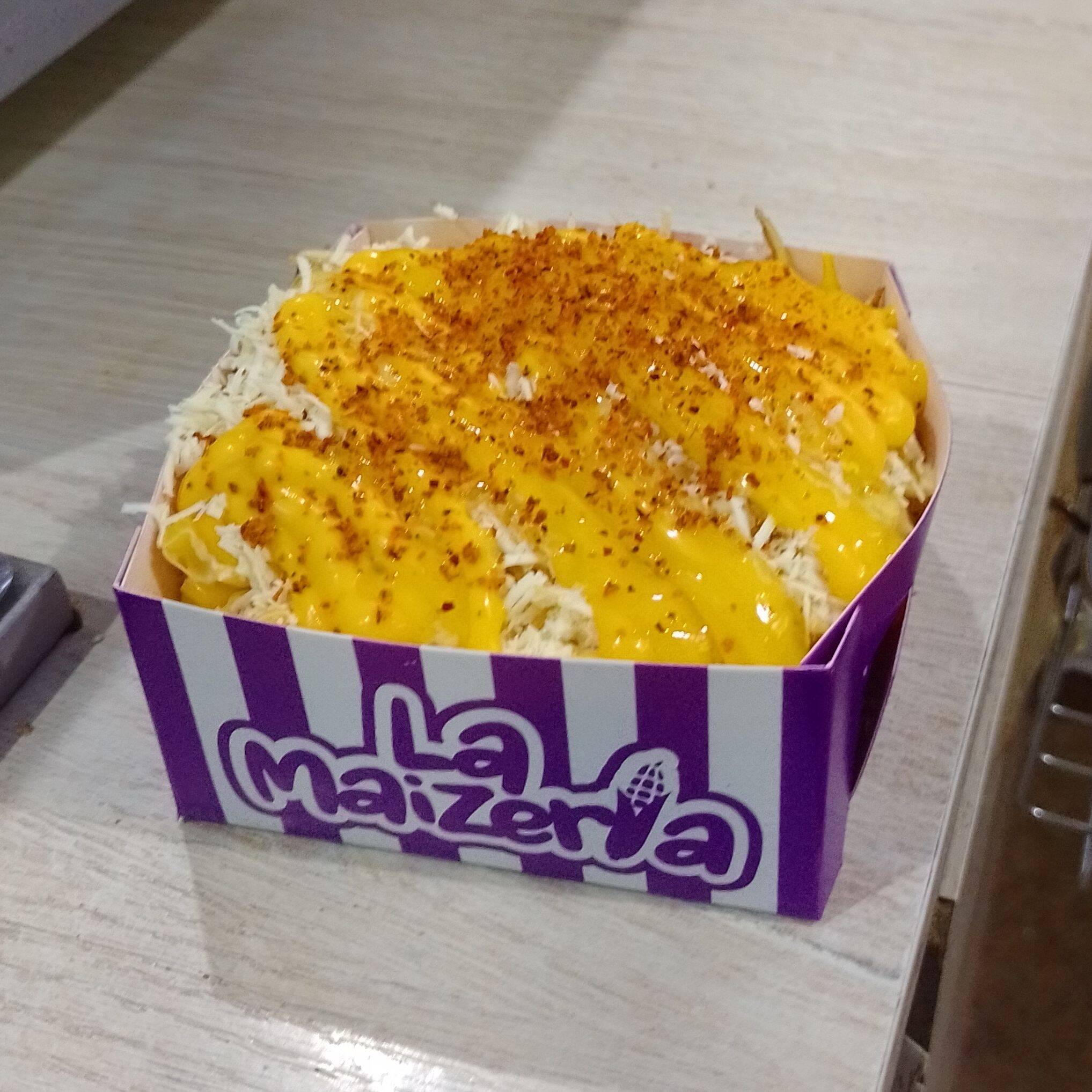 Mazorca desgranada de maíz dulce con mantequilla, queso crema, queso costeño, salsa maíz dulce, tajín y chipotle.
