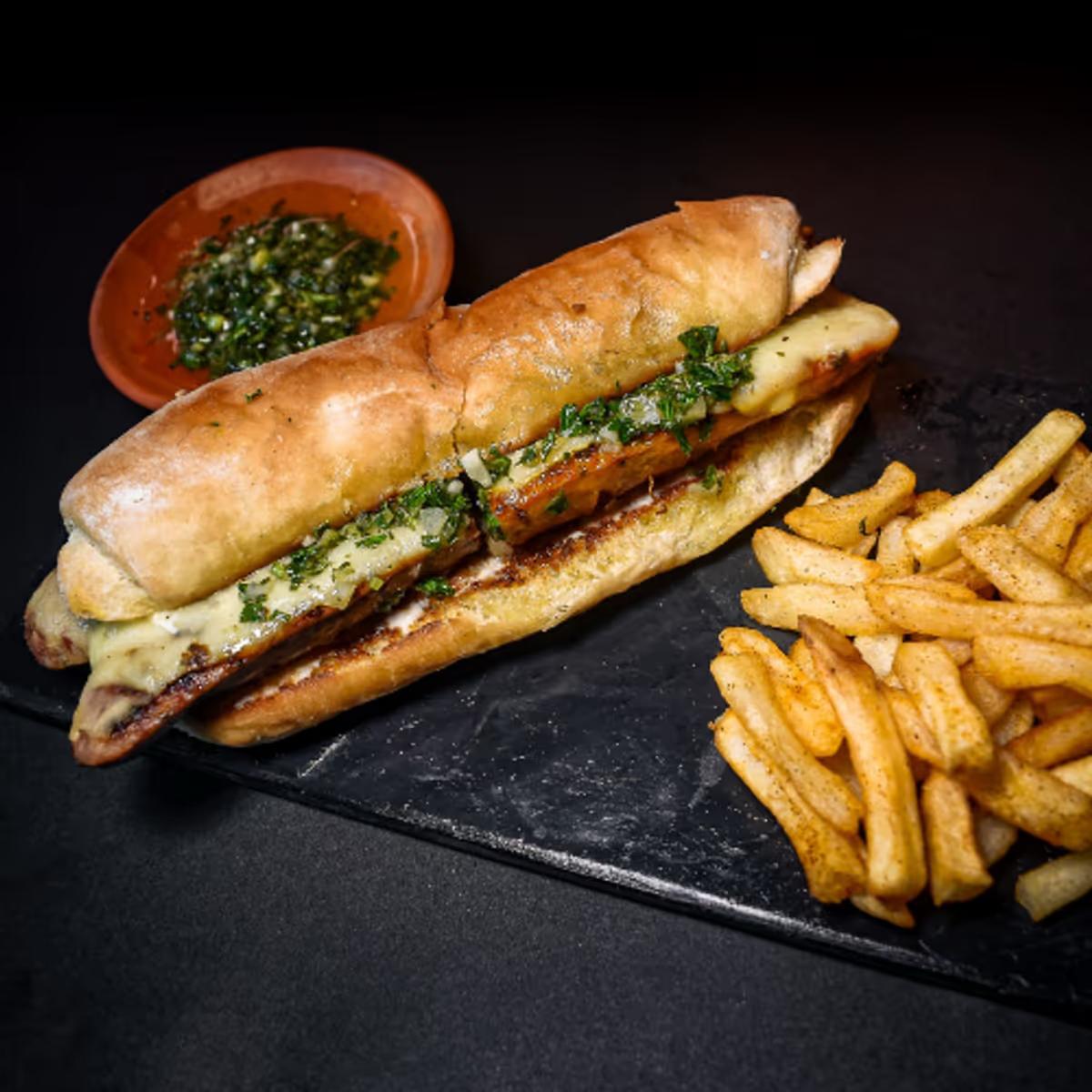Acompañado de papas fritas, pan blanco rústico hecho en la poppera®, chorizo antioqueño, chorizo argentino, chimichurri y mayodijon.
