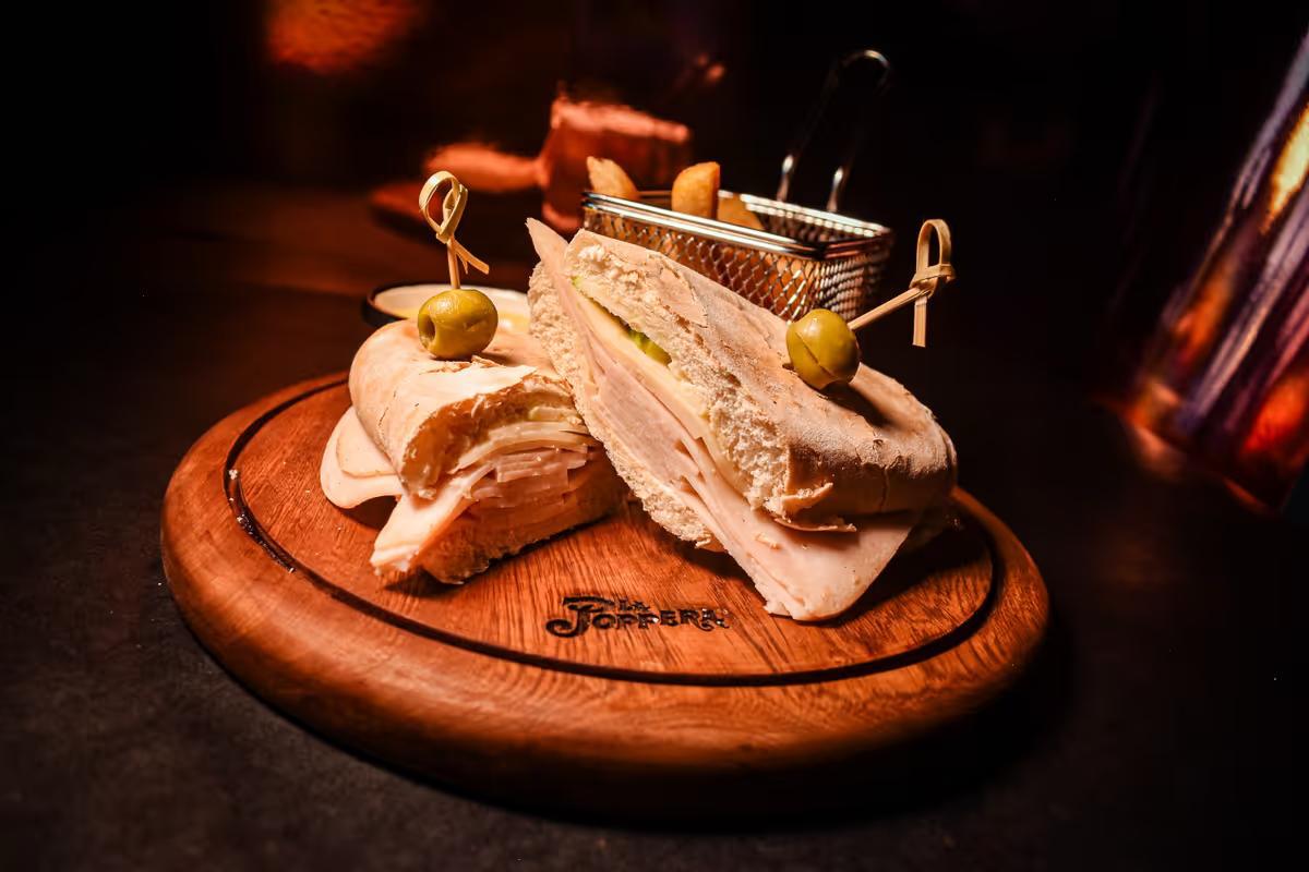 Pan blanco rústico hecho en la poppera, jamón de pavo, tomate, manzana, queso provolone y mayodijon.