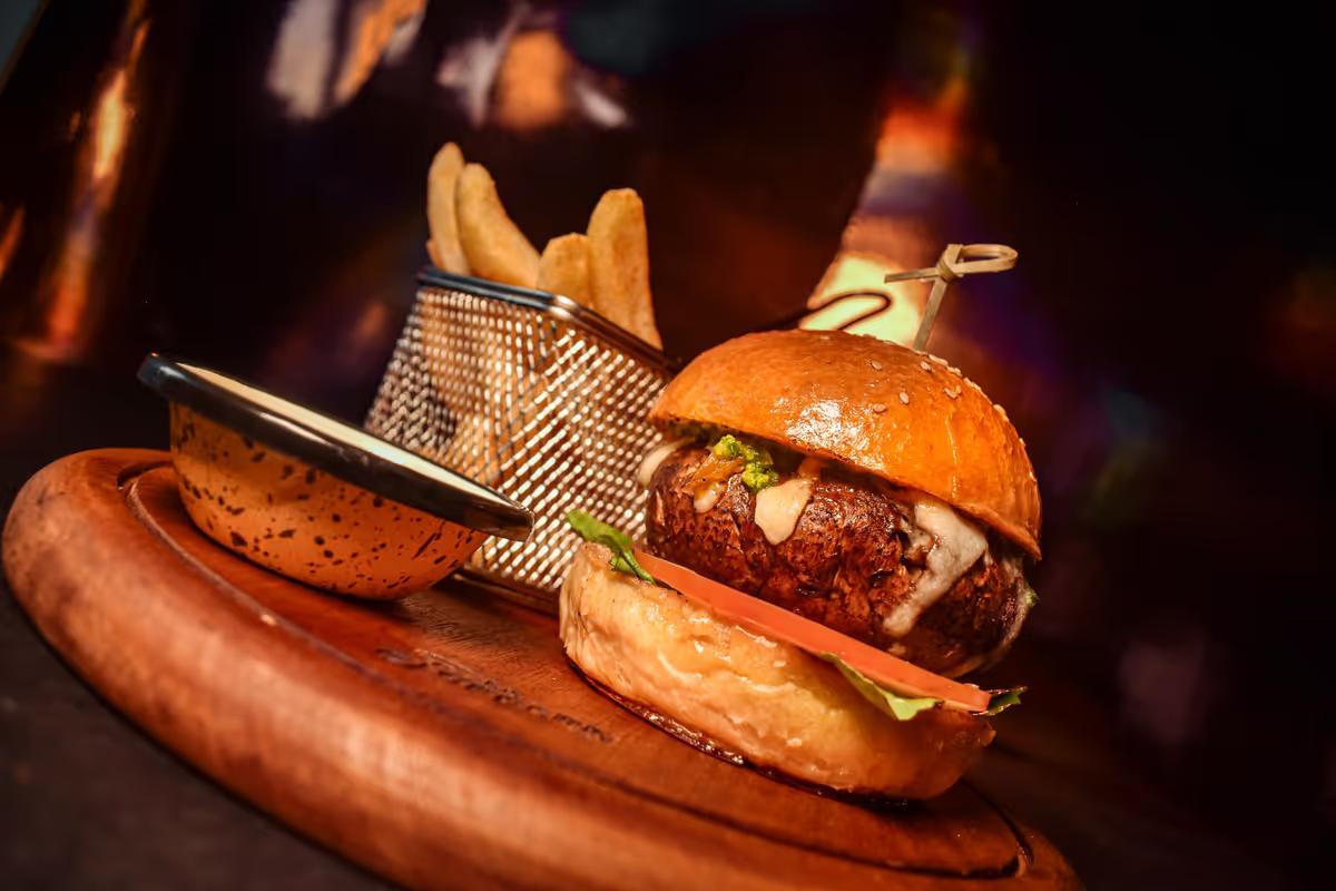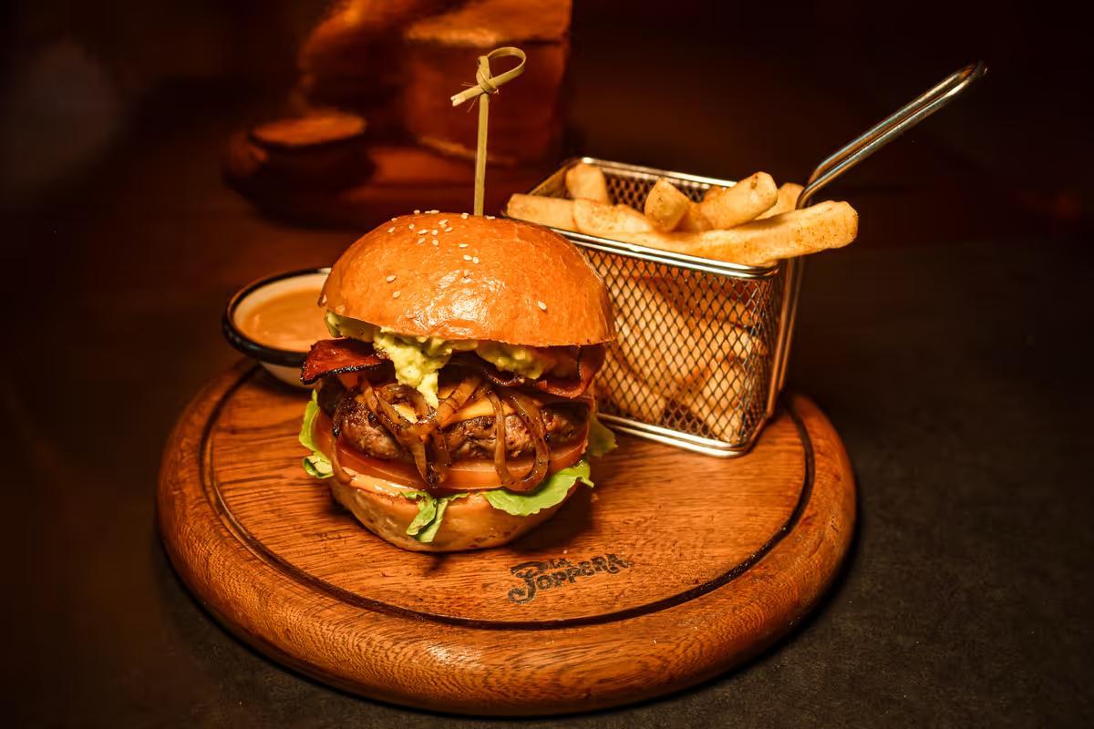 pan artesanal suave, esta creación de la poppera gastro bar contiene una jugosa carne premium de 150 g, cubierta con queso costeño gratinado. la experiencia se intensifica con un topping de chicharrón confitado, tocinetas crujientes y chorizo antioqueño, todo coronado con chimichurri fresco y una delicada salsa trufada