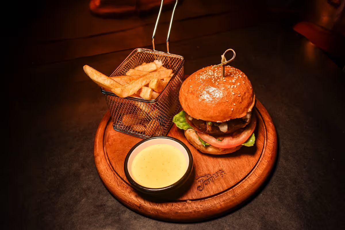 Pan brioche hecho en la poppera, 1 ud de portobello a la parrilla, gratinado al horno y una salsa chimichurri, tomate, rúgula, queso provolone, cebolla salteada y salsa de la casa.