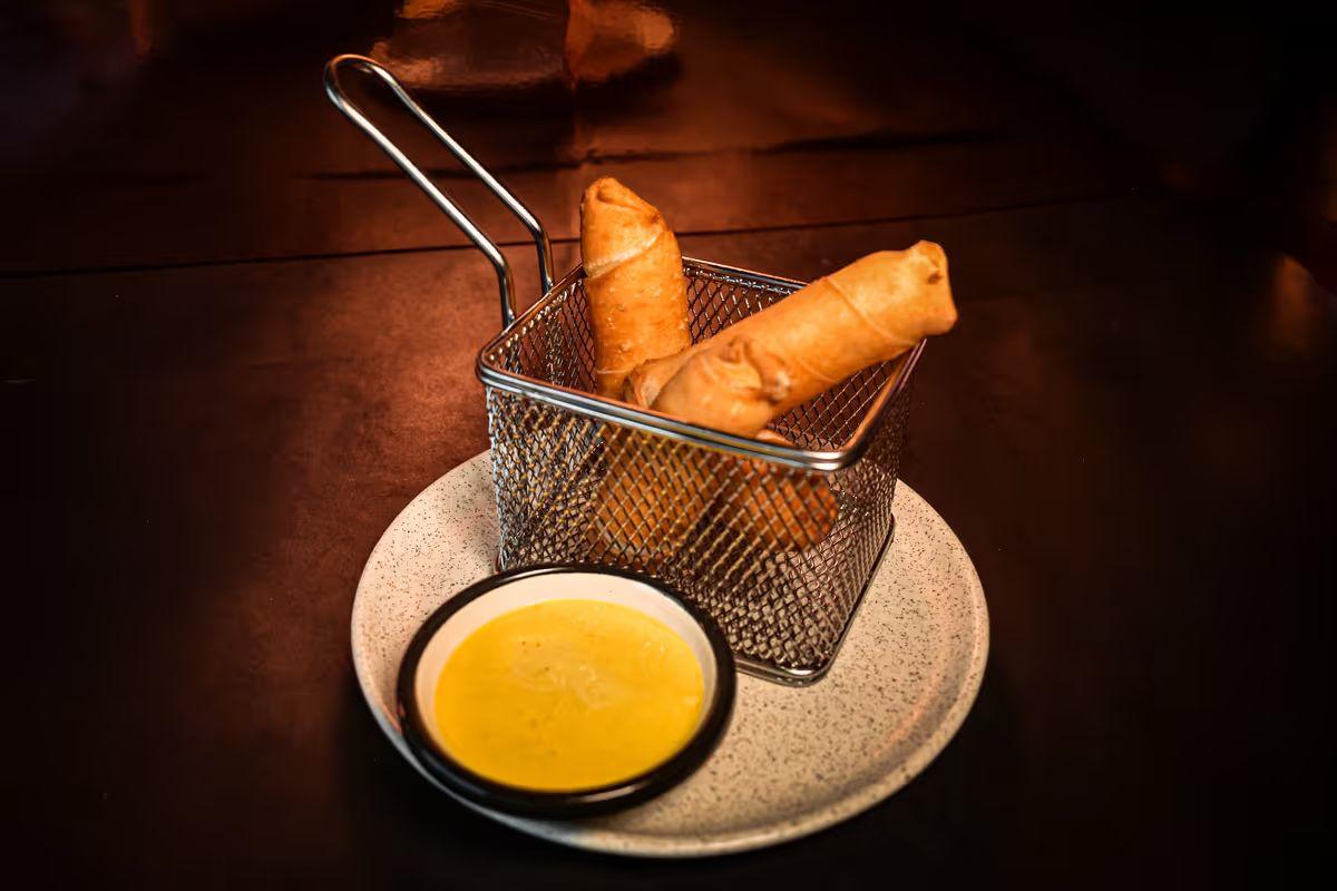 100 g De cangrejo apanado en panko, rúgula, guacamole, cebolla roja y salsa de la casa, acompañada de papas fritas.
