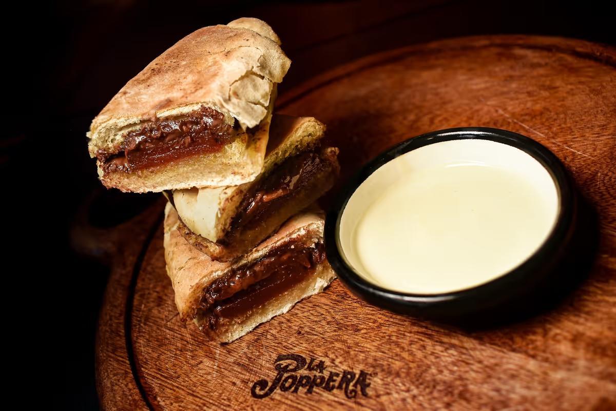 Pan blanco rústico hecho en la poppera, bocadillo, chocolate semiamargo, toque de queso azul y salsa queso azul.