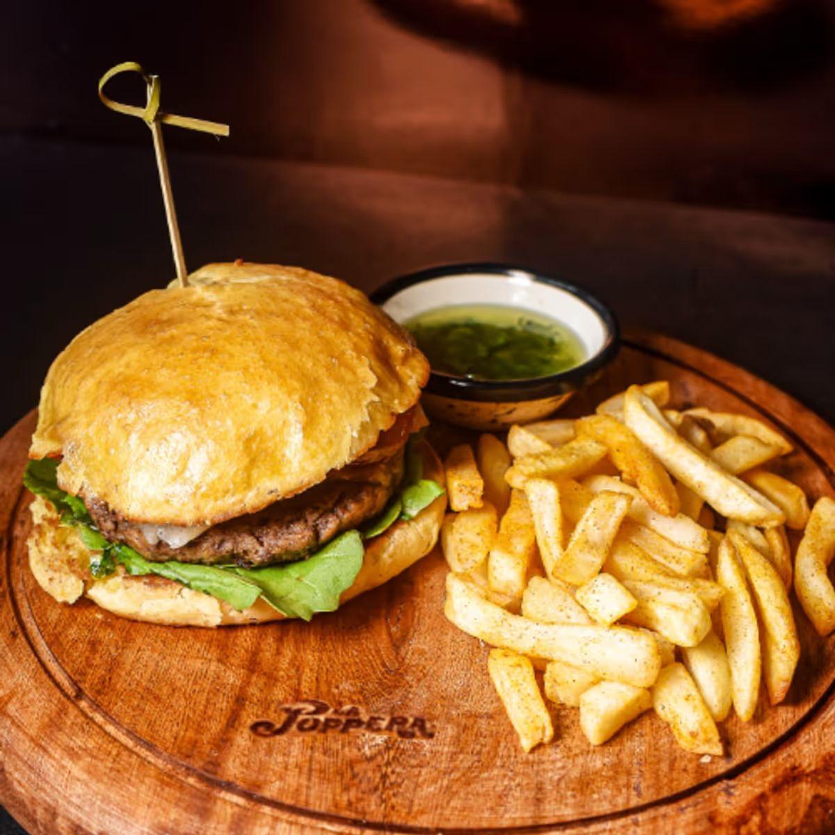 150 gr de carne premium, pan brioche hecho en la poppera, queso costeño asado, tocineta confitada en bbq y vino tinto, chimichurri, papa ripio crujiente, tomate y lechuga fresca (NO INCLUYE PAPAS FRITAS)