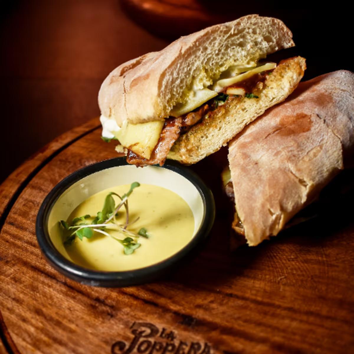 150 Gr de pechuga de pollo apanada al panko, pan hecho en la poppera®, salsa bbq, rugula, tomate, cebolla caramelizada, queso cheddar y chimichurri.