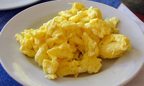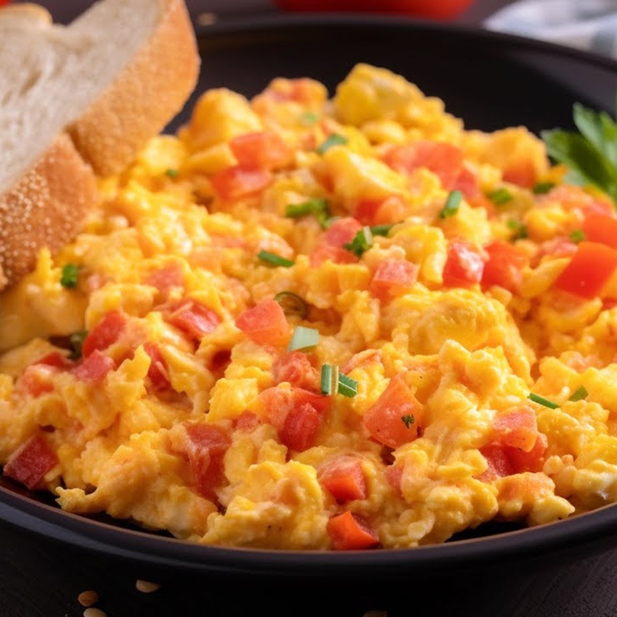 Huevos con tomate y cebolla acompañados de bollo limpio.