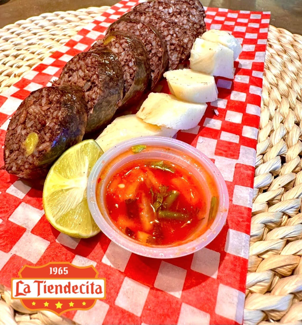 Chicharrón, chorizo, morcilla acompañada de bollo limpio.