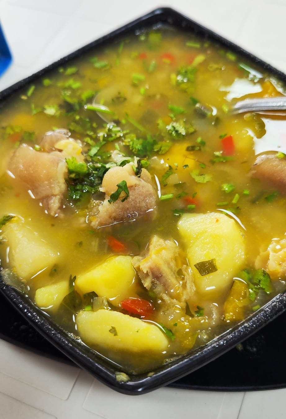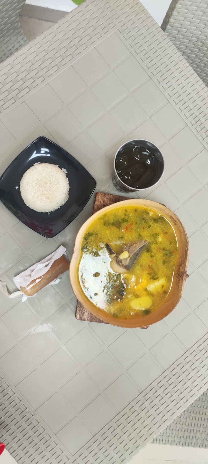 Sopa mondongo, arroz, ensalada, granos, proteína, agua de panela.