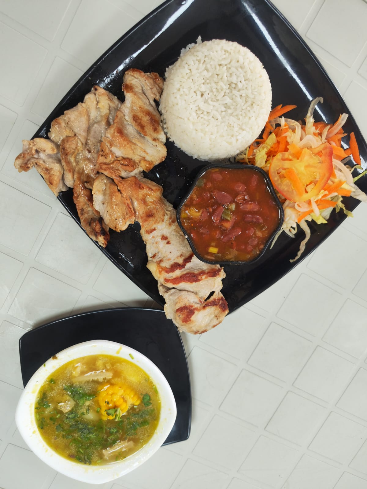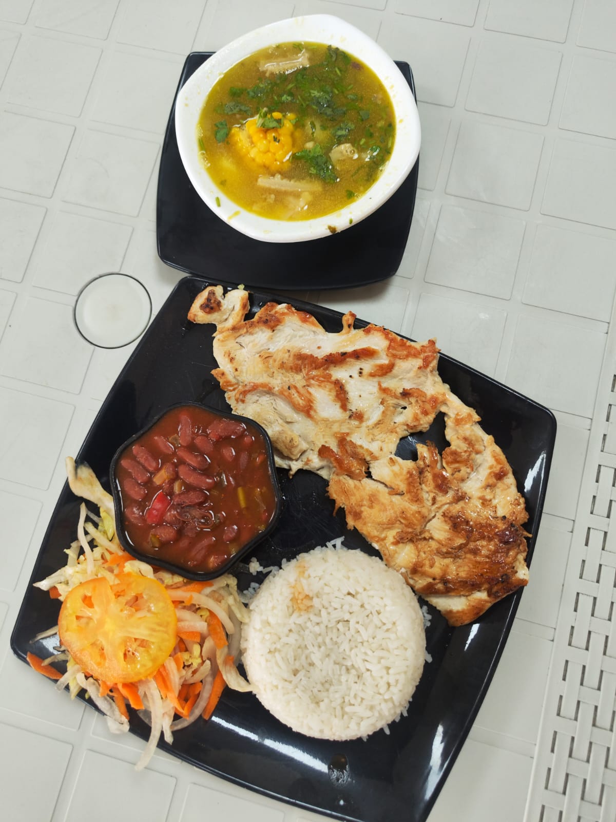 Sopa, arroz, ensalada, granos, proteína, agua de panela.