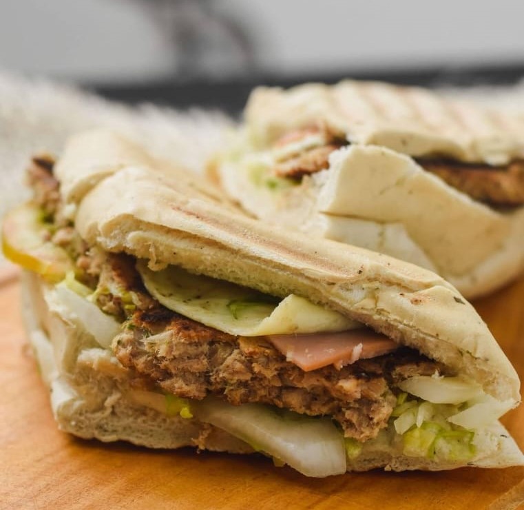Pan artesanal del día, doble atún, lechuga, tomate milano, cebolla blanca y salsas de la casa.