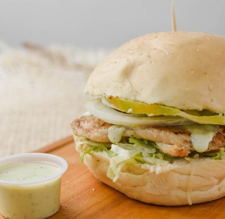 Pan artesanal del día, pechuga, lechuga, tomate milano, cebolla blanca y salsas de la casa.
