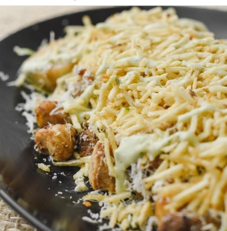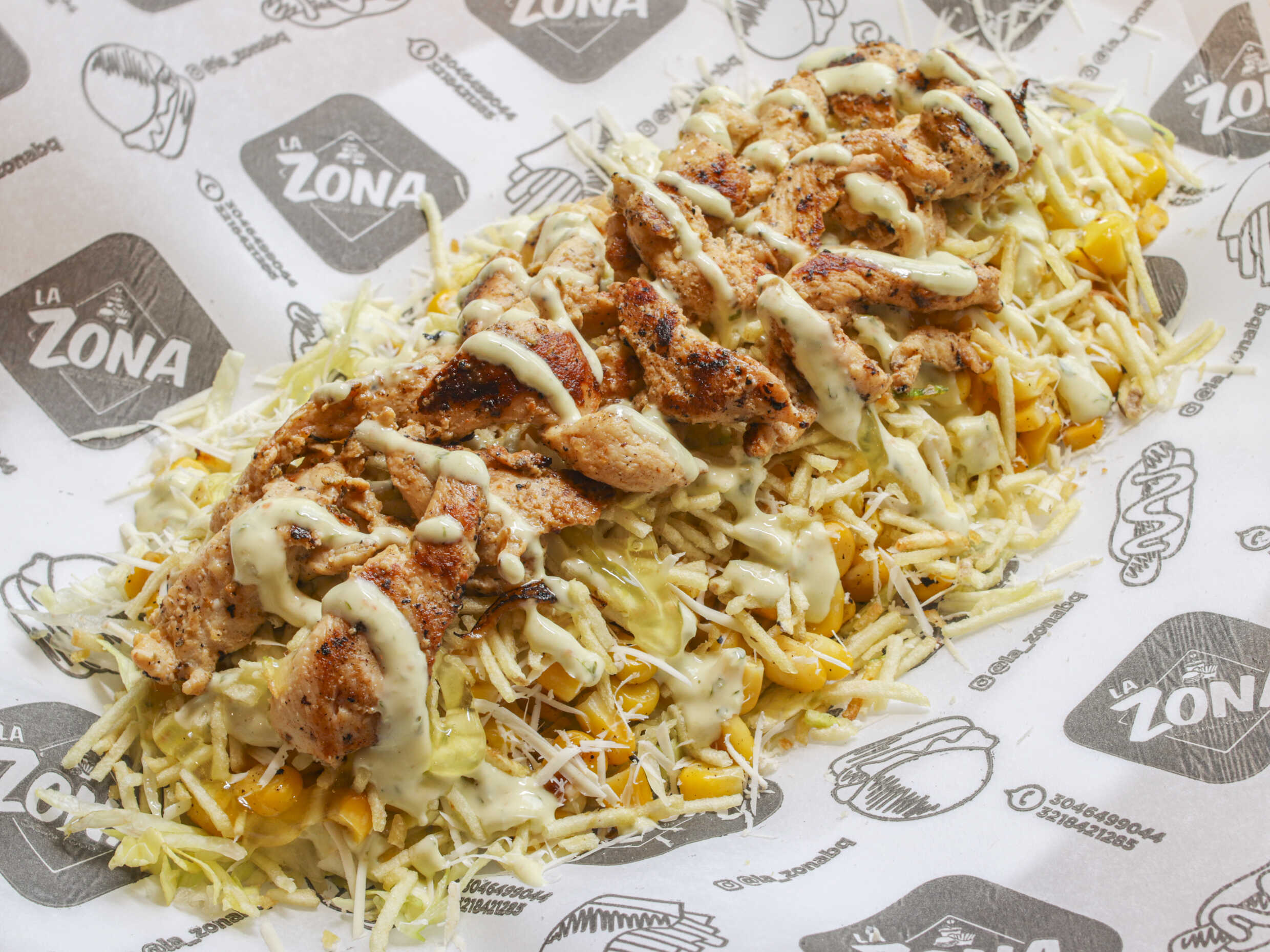 Lechuga, papa francesa, manguera, pollo juliana, queso costeño, papa chongo y salsas de la casa.