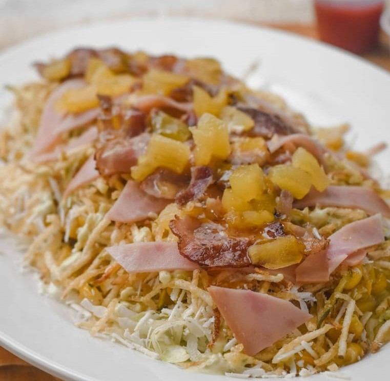 Tocineta, mozzarella, maíz tierno, lechuga, queso costeño, piña, salsa de la casa.