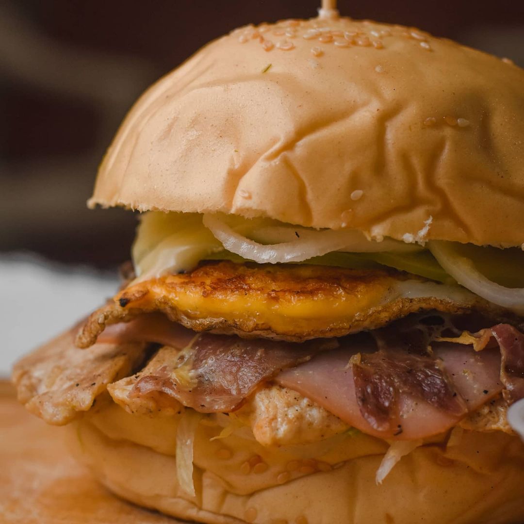 Pan artesanal del día, carne, queso mozzarella, jamón, tocineta, huevo, lechuga, tomate milano, cebolla blanca y salsas de la casa.
