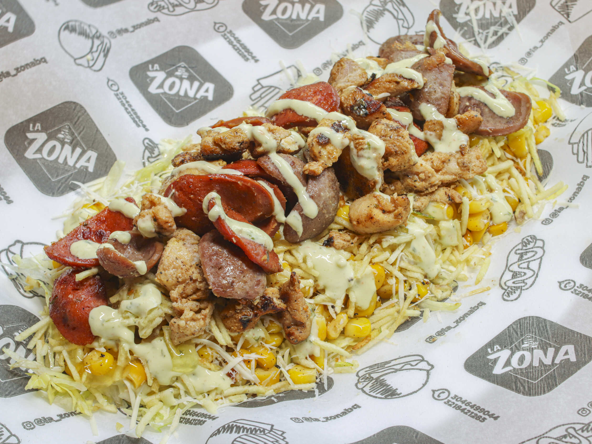 Lechuga, queso costeño, papa chongo, papa francesa, bollo, pollo, carne, chorizo, butifarra, suiza, maíz, pimentón, cebolla y salsa de la casa.