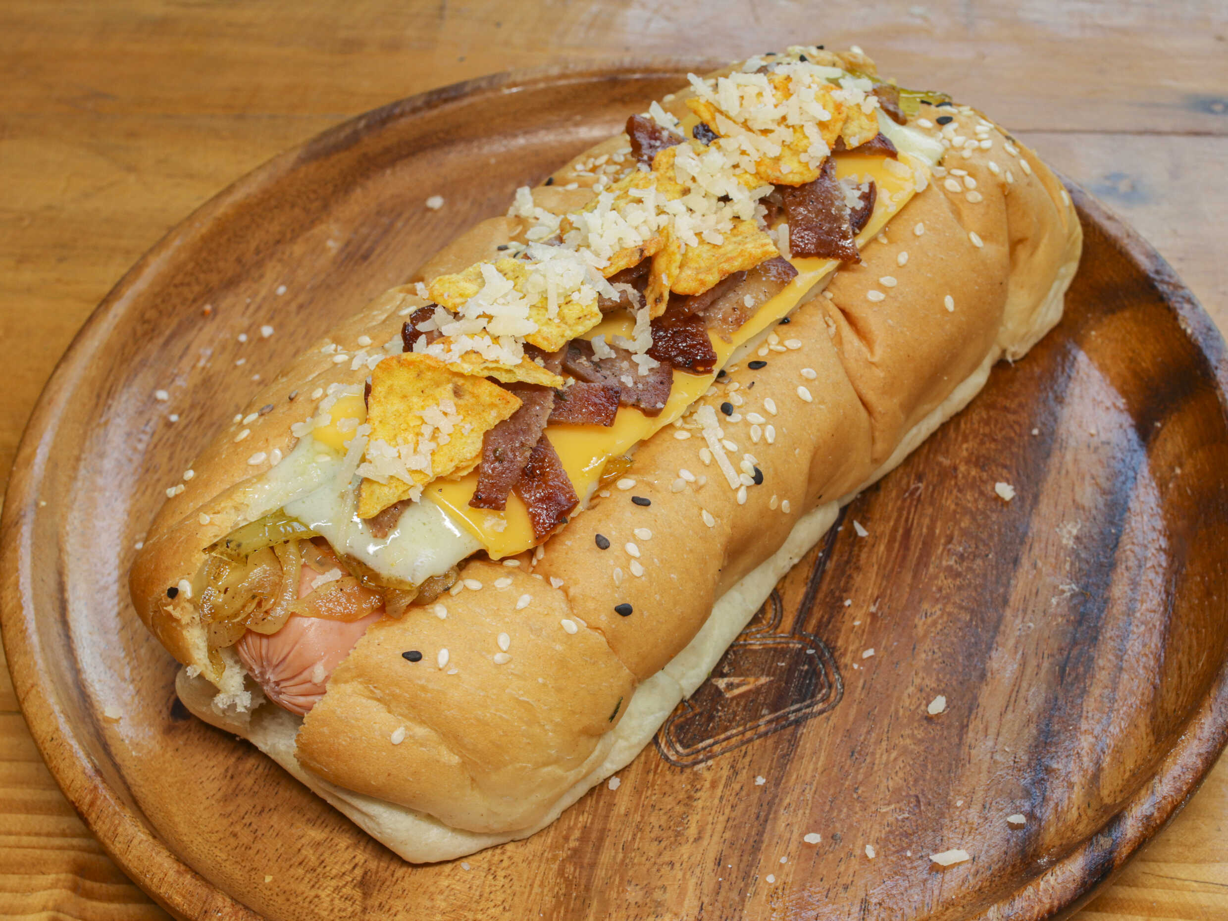 Pan artesanal brioche del día, salchicha americana, cebolla caramelizada, triple queso mozzarella, cheddar y parmesano, doritos y salsa de la casa.