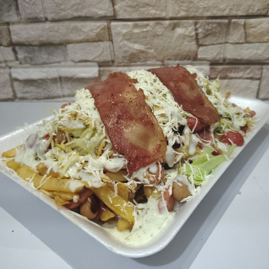 250gr de papas a la francesa, salchicha, pollo, carne, lechuga fresca, queso, papa chongo, y salsas de la casa.