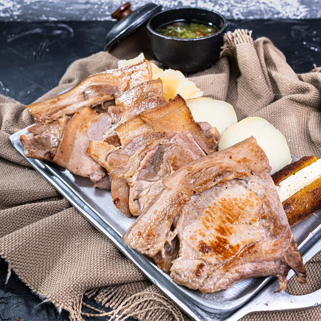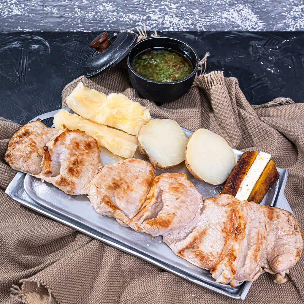 Combinado Antioqueño con Zaragozas, Carne Asada, Chorizo, Huevo frito, Arroz Blanco, Maduro con queso, arepa asada y Papas a la Francesa.