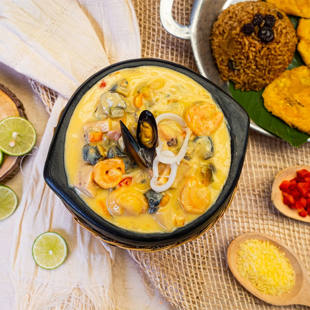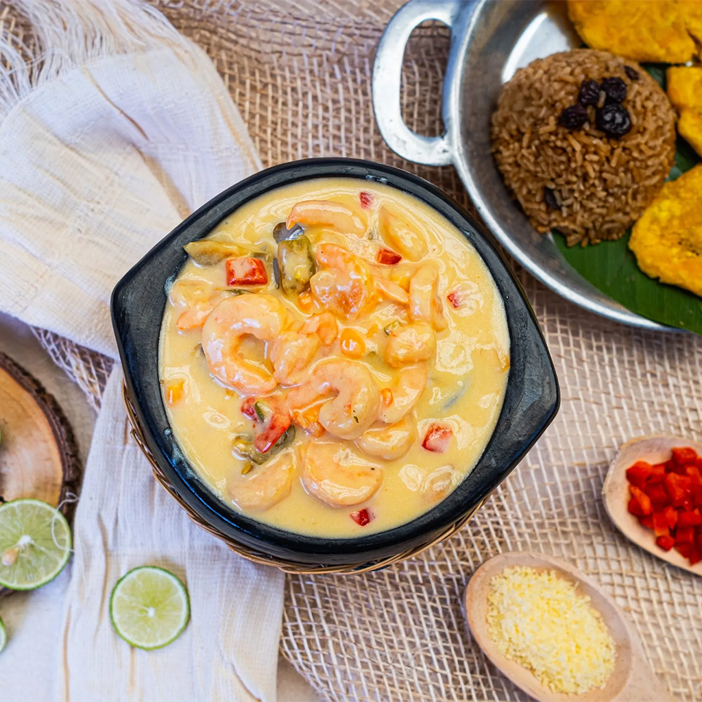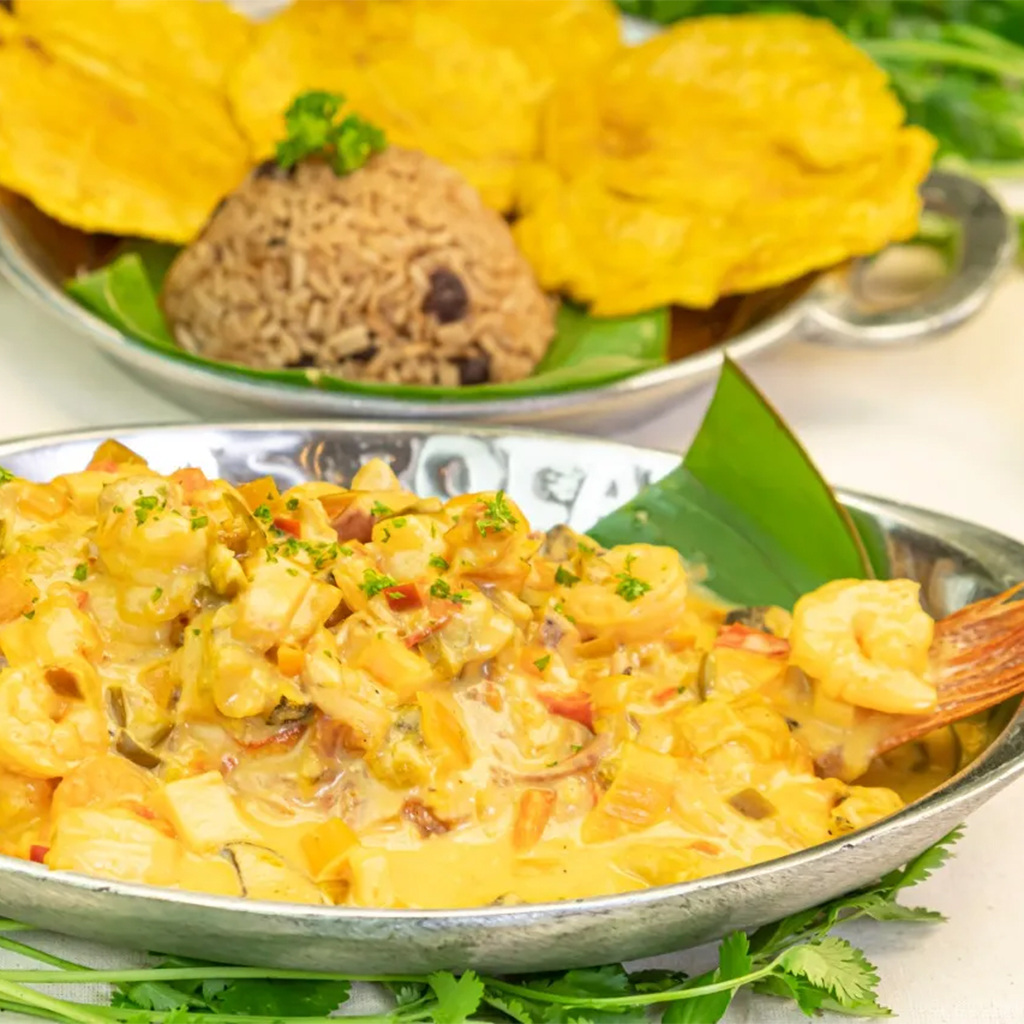 Posta Cartagenera acompañada de Arroz con coco, Moneditas de Plátano y Ensalada de Aguacate.