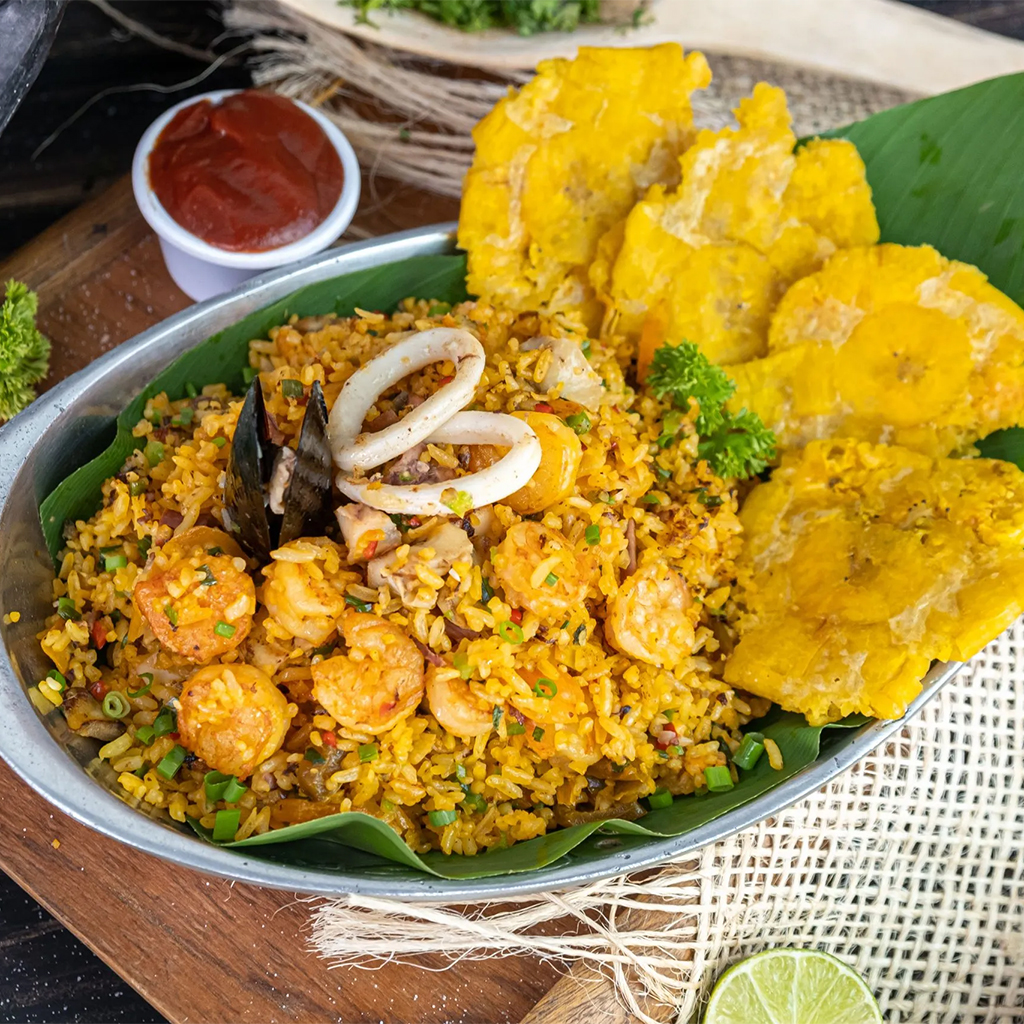 Arroz Mixto de Pollo y Camaron acompañado de patacones de platano verde