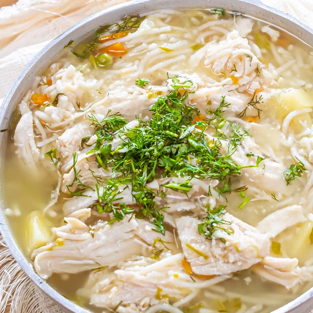 Sopita de Fideos con Pollo acompañada de Arroz Blanco.