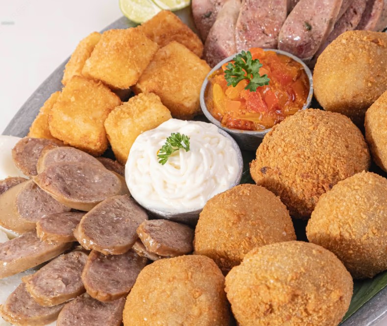 Una entrada pa' compartir. Un carnaval con mix de sabores: Croquetas de cayeye, roquiquesitos, chorizo, butifarra, bollo limpio, limón, hogao y suero.