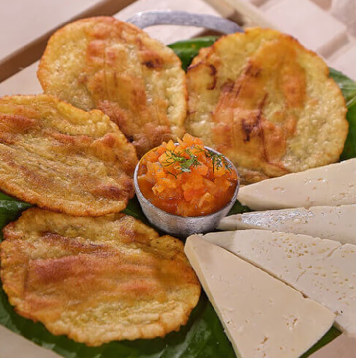 4 und Patacones de Guineo verde acompañados de Queso Costeño y Hogao