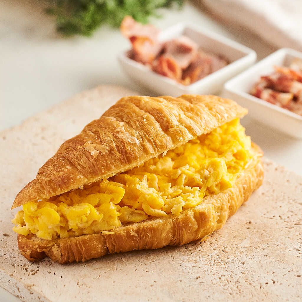 Croissant de mantequilla, huevos revueltos. Tienes opción de adicionar tocineta o jamón.