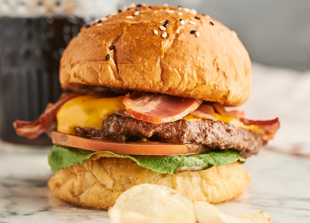 Carne 100% Angus, pan pretzel, queso cheedar, tocineta ahumada, lechuga romana, tomate, papas a la francesa.