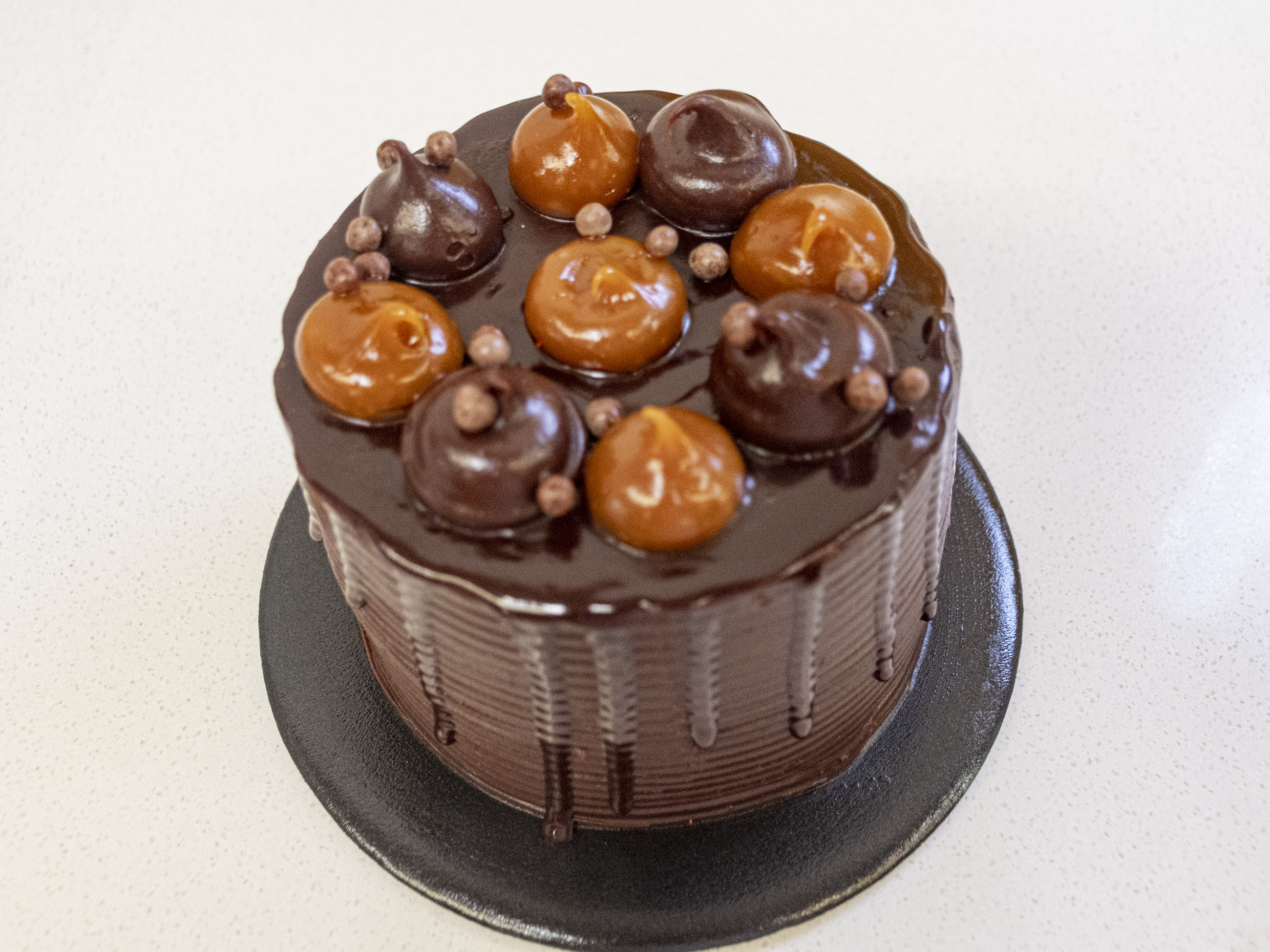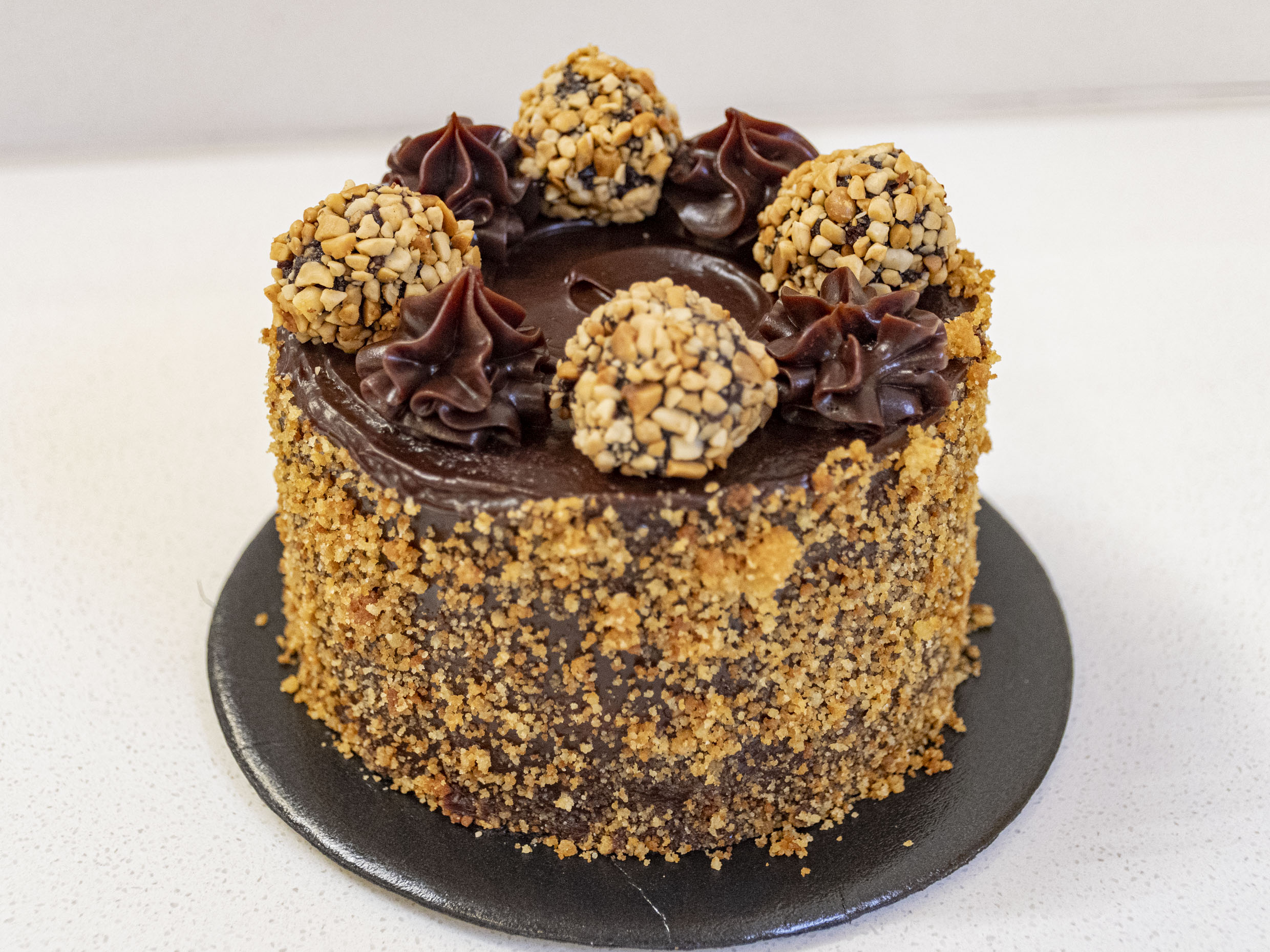 Torta de chocolate, rellena de crema de Ferrero y ganache de chocolate y recubierta de nueces crocantes. 4 porciones