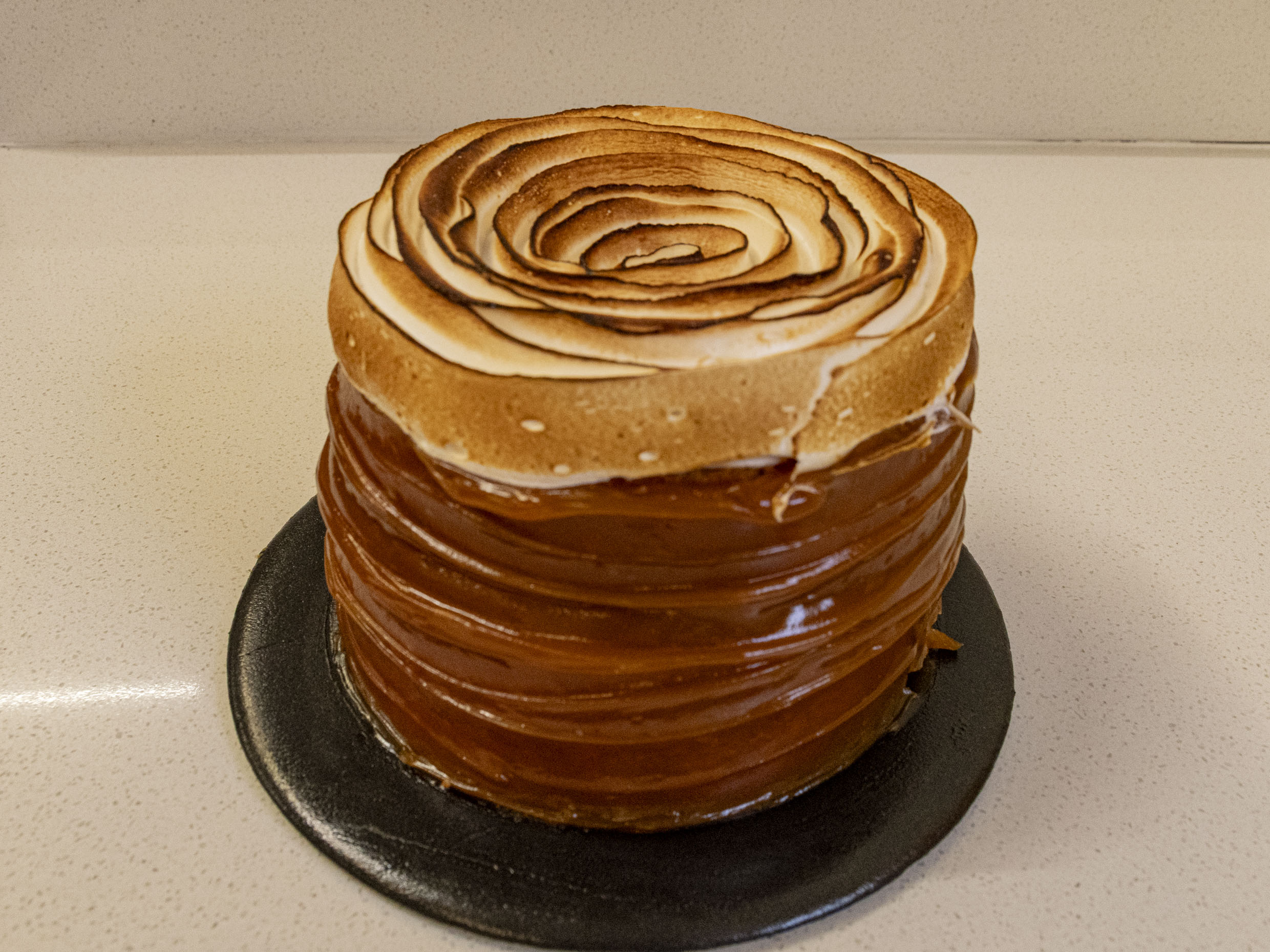 Torta de vainilla, relleno de arequipe y confitura de frutos rojos casera. Recubierta de arequipe y merengue flambeado.