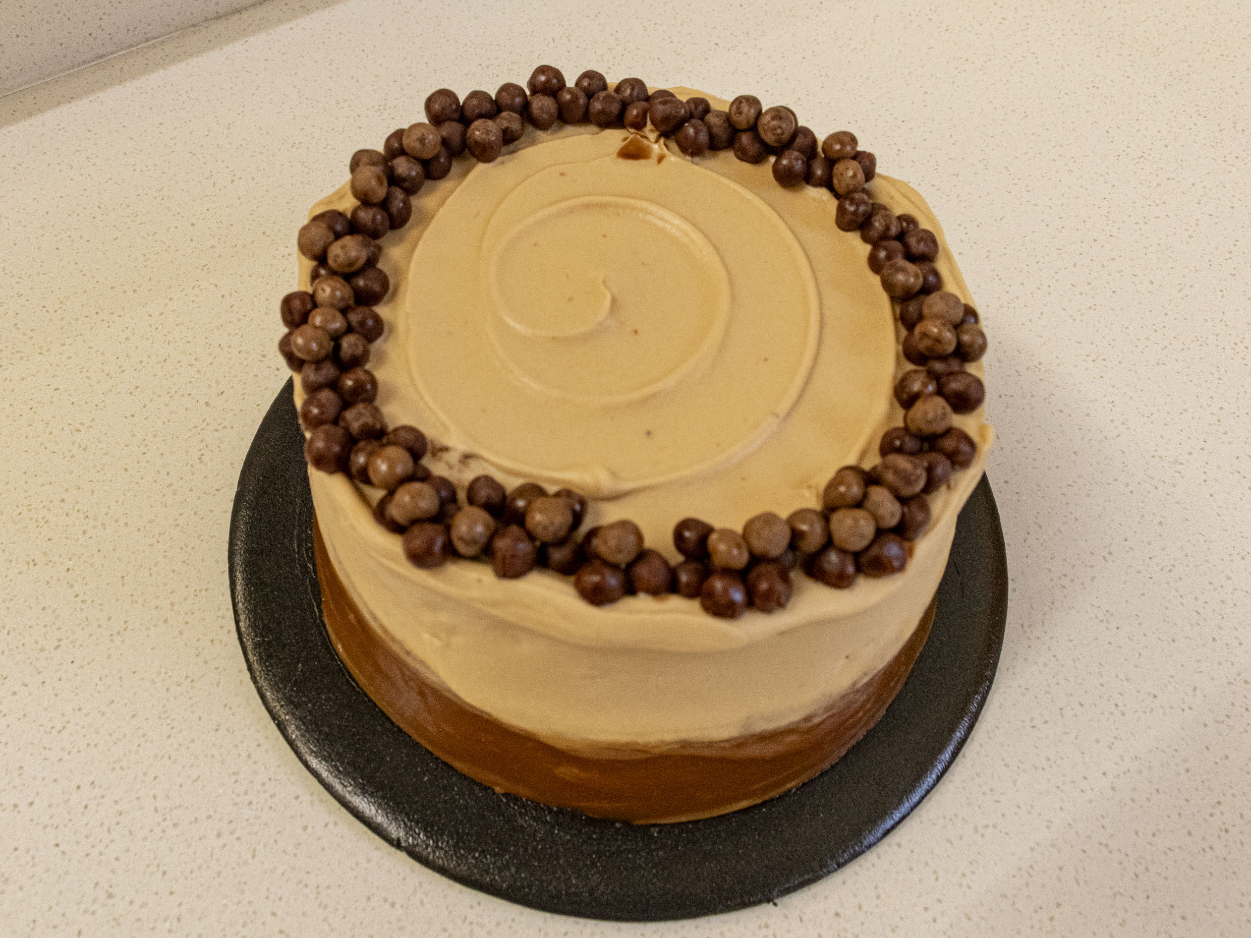 Bizcocho esponjoso de vainilla con relleno de arequipe. Decorado con arequipe y crujiente de galleta. 16 porciones