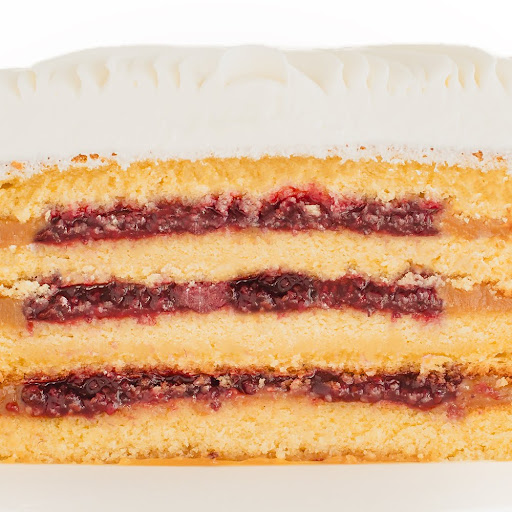 Torta de vainilla, relleno de arequipe y confitura de frutos rojos casera. Recubierta de arequipe y merengue flambeado. (4 porciones).