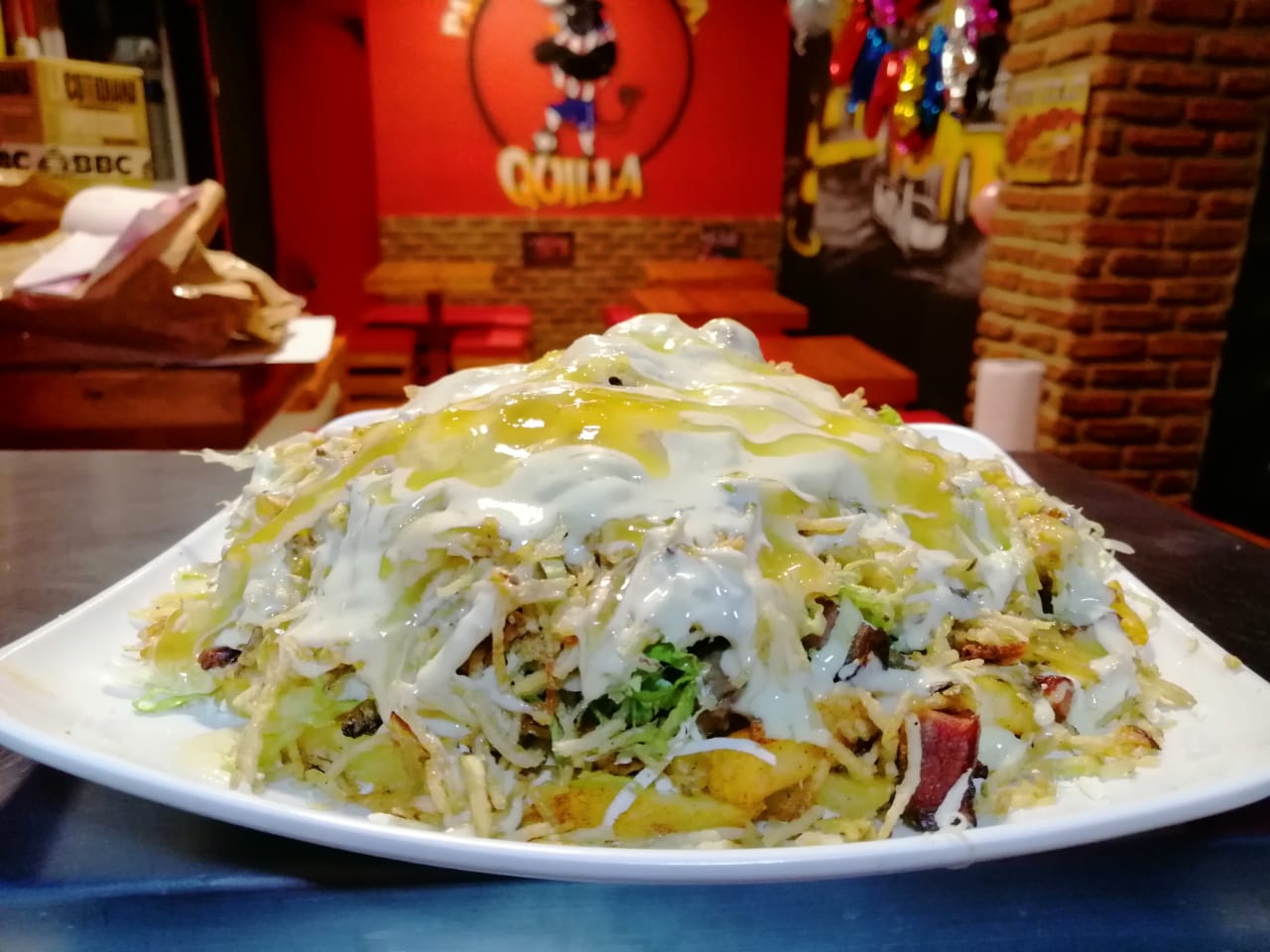 Rodajas fritas de salchicha, papitas fritas, queso rallado, papa chongo, salsa de la casa.