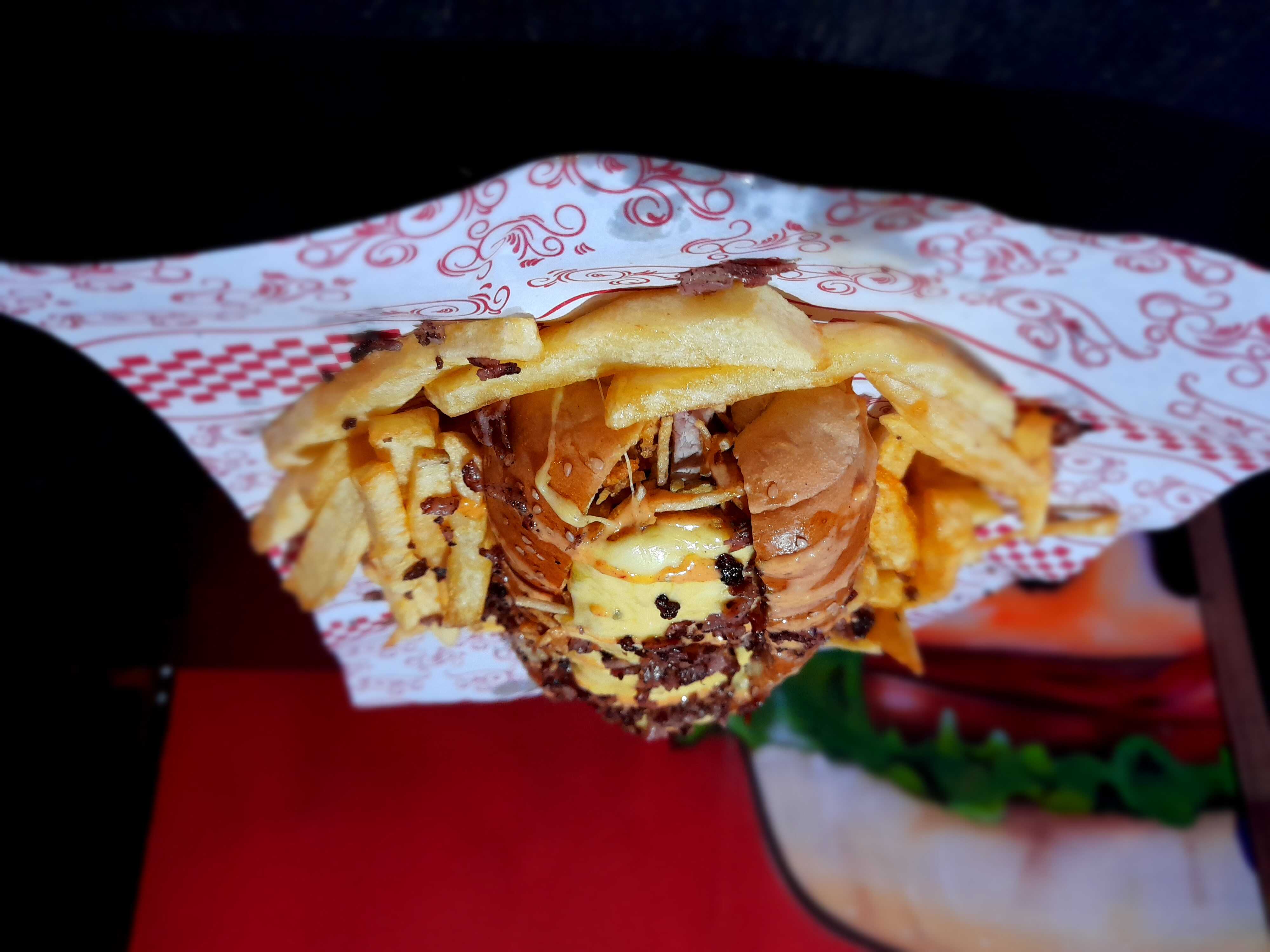 Hamburguesa con pan brioche, 180 g de carne angus + 120 gr de carne llanera más papa francesa.