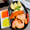Carne llanera 300 g, costilla 2 uds, chorizo 1 ud, morcilla 2 uds acompañada de papa y yuca al vapor, monedas de plátano, guacamole y salsa hot.