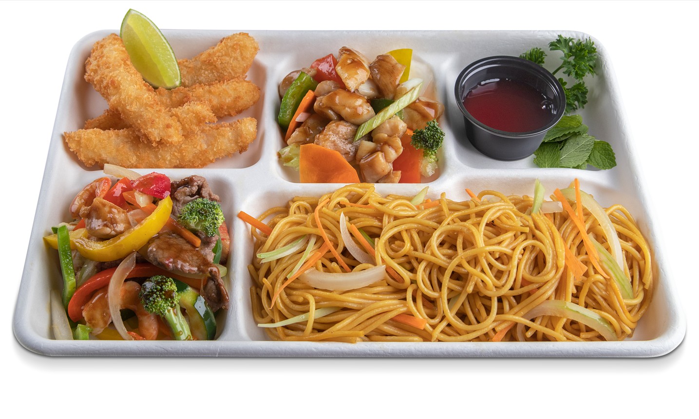 Arroz frito o pasta, más cuatro opciones a elección el buffet (pollo agridulce, pollo teriyaki, chop suey mixto, res en pimienta negra, cerdo ahumado, dos unidades de lumpia, 4 croquetas de yuca, chop suey de camarón).