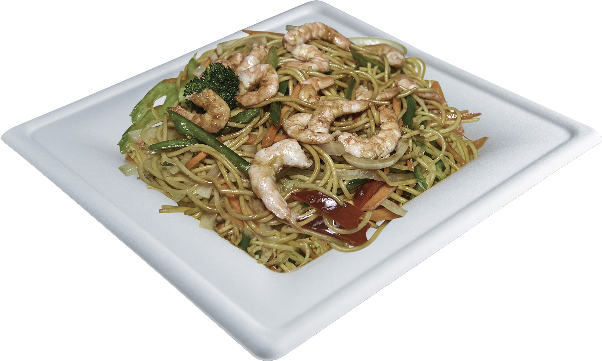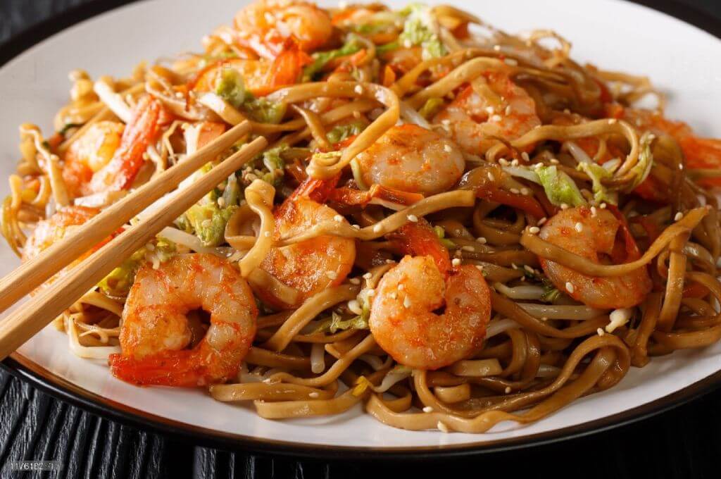 Tallarines especiales con camarones y vegetales en salsa long hang.