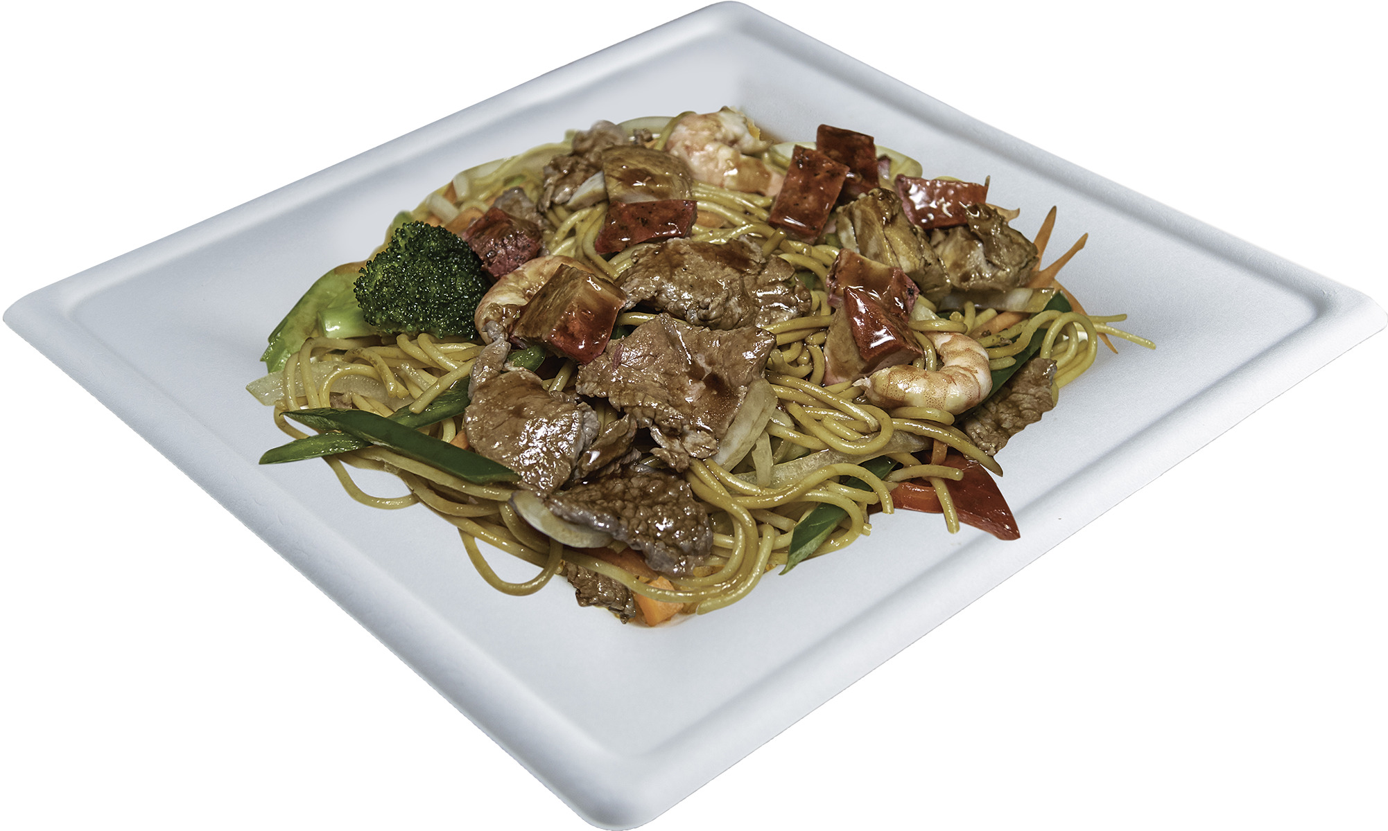 Tallarines especiales con carne de res, cerdo, camarón pollo cebolla a la juliana y salsa teriyaki.