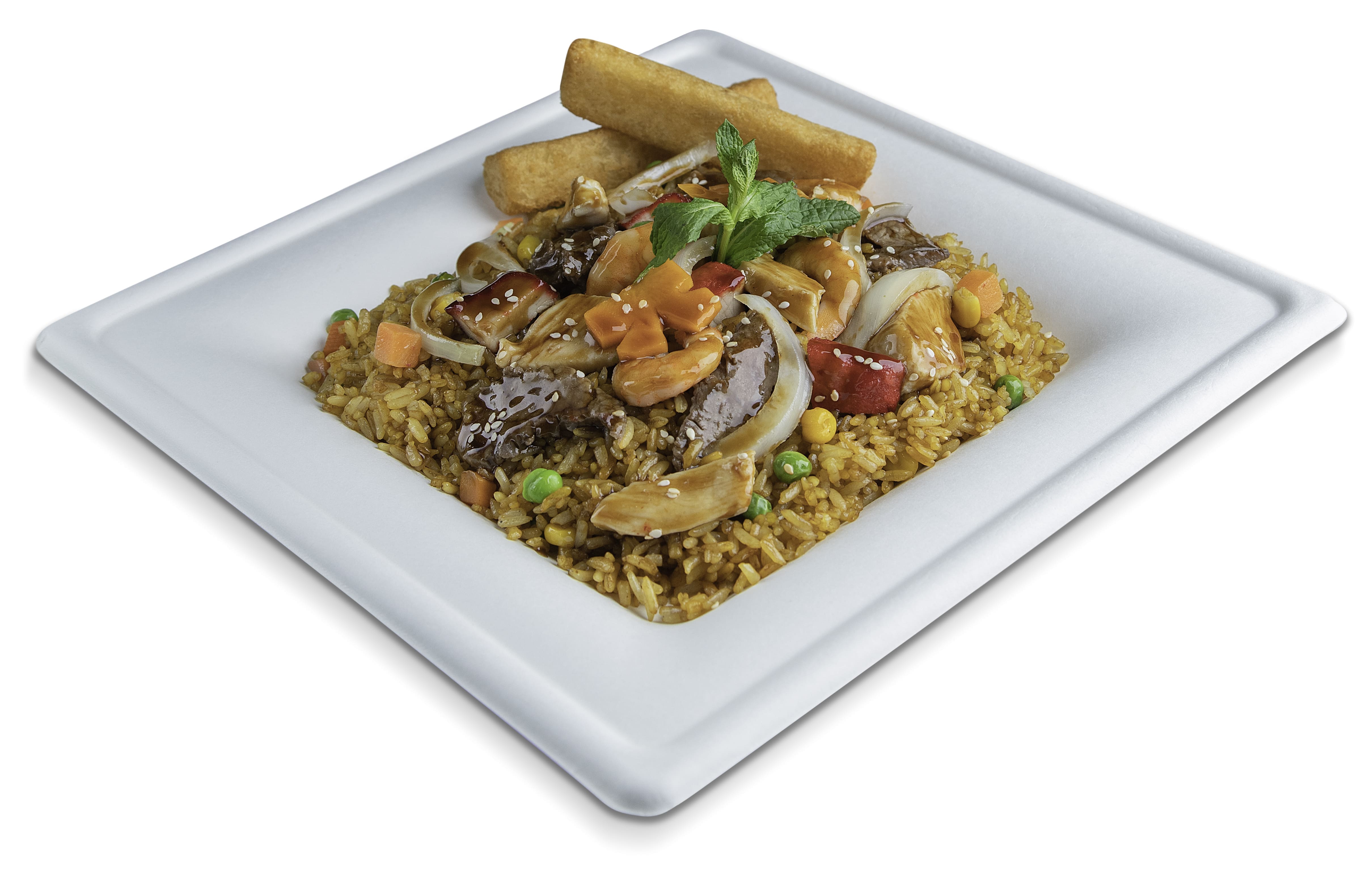 Arroz frito con carne de res, cerdo, camarón, pollo, cebollas en juliana y salsa teriyaki.