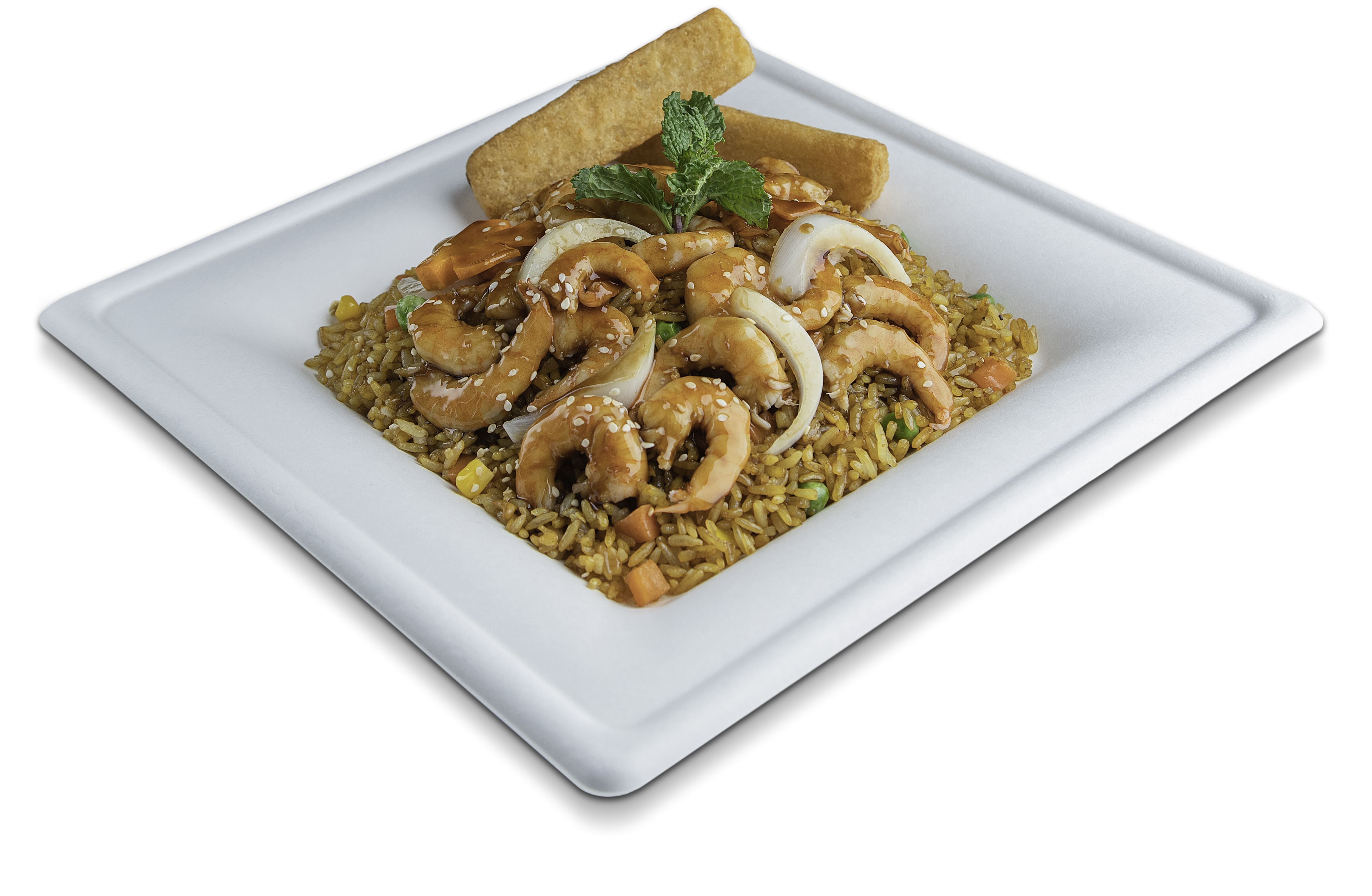 Arroz frito con camarón y vegetales en salsa teriyaki.