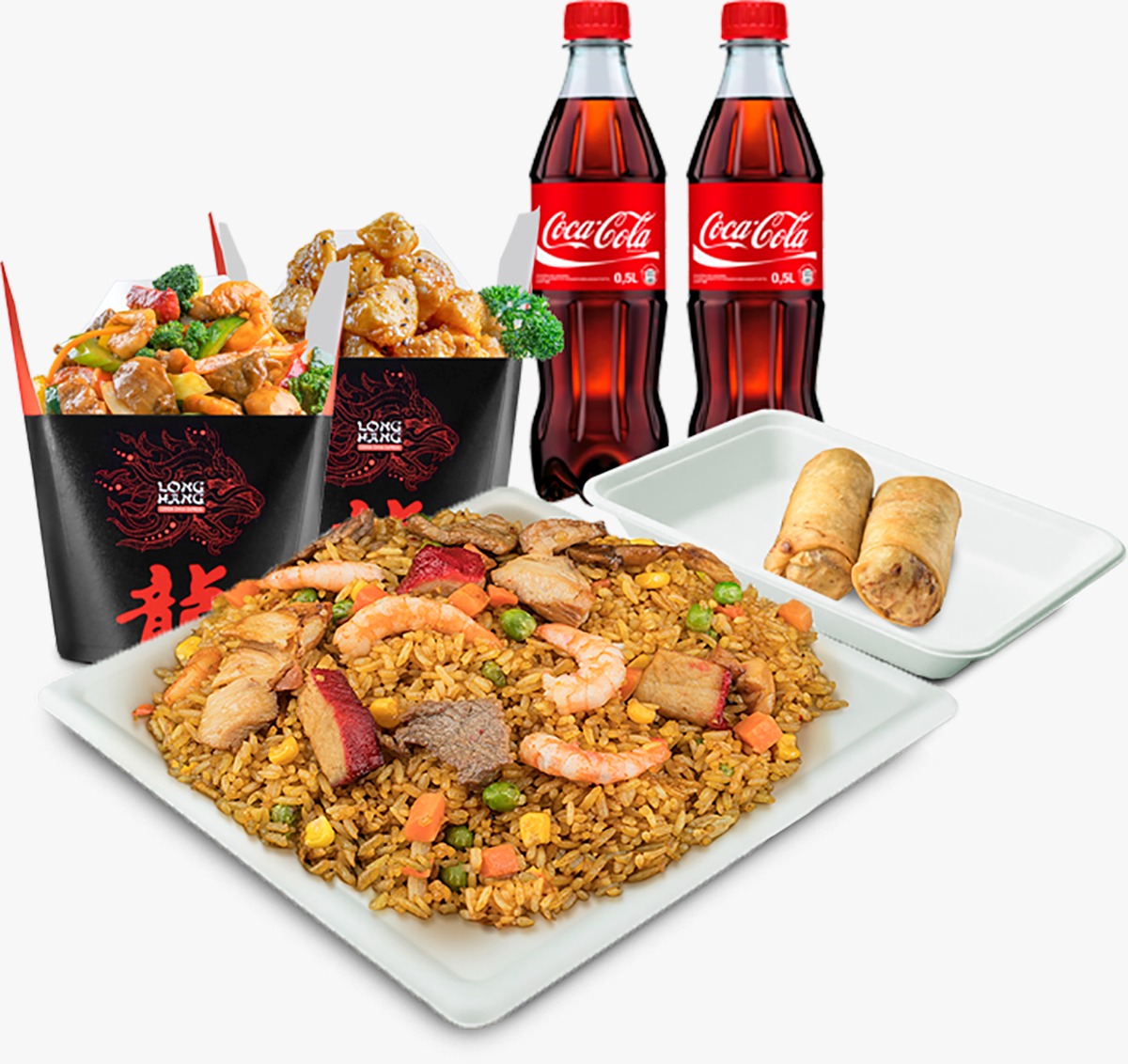 Arroz súper long pequeño acompañado de ½ porción de pollo agridulce, ½ porción de chop suey, 2 crocantes lumpias y 2 Coca-Cola 400 ml. Ideal para 2 a 3 personas.
