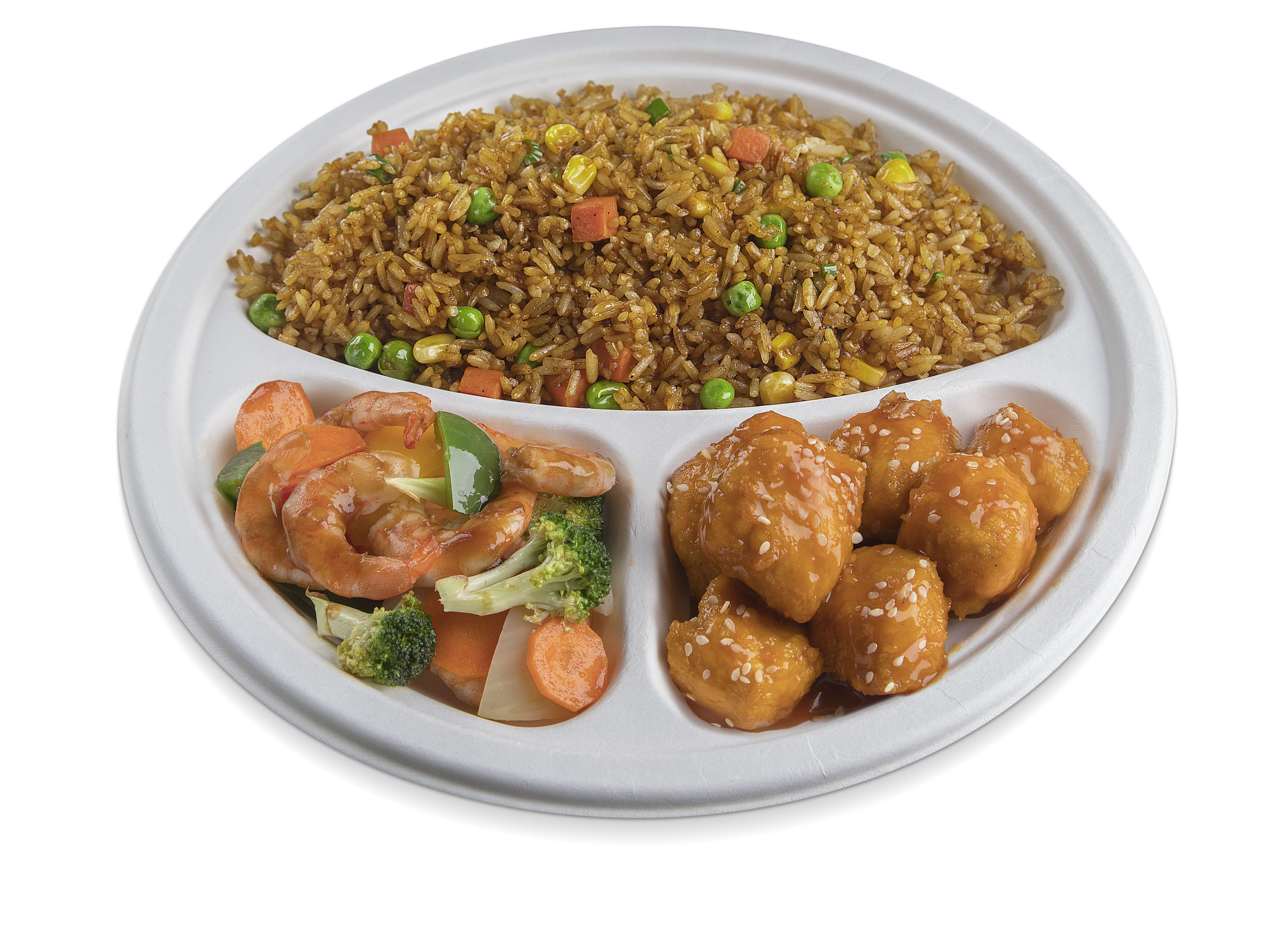 Arroz frito o tallarines, más tres opciones a elección del buffet (pollo agridulce, pollo teriyaki, chop suey mixto, res en pimienta negra, cerdo ahumado, dos unidades de lumpia, 4 croquetas de yuca, chop suey de camarón).