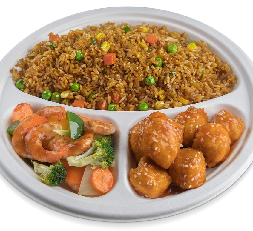 Arroz frito o tallarines, más tres opciones a elección del buffet (pollo agridulce, pollo teriyaki, chop suey mixto, res en pimienta negra, cerdo ahumado, dos unidades de lumpia, 4 croquetas de yuca, chop suey de camarón).