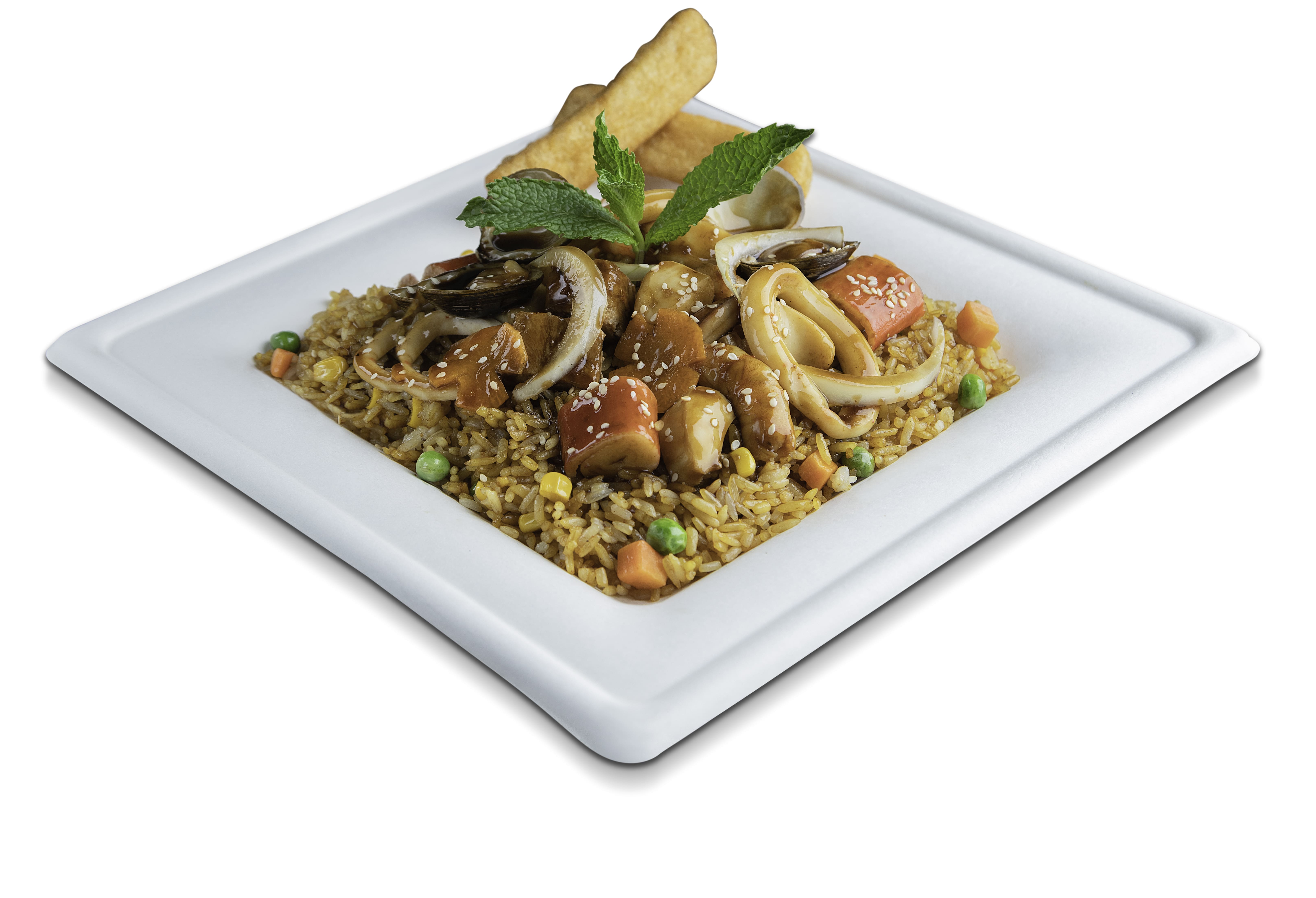 Arroz frito con anillos de calamar, mejillones, calamar, camarón, ostras, pulpo, palmitos de cangrejo, pescado, cebolla en julianas y salsa teriyaki.
