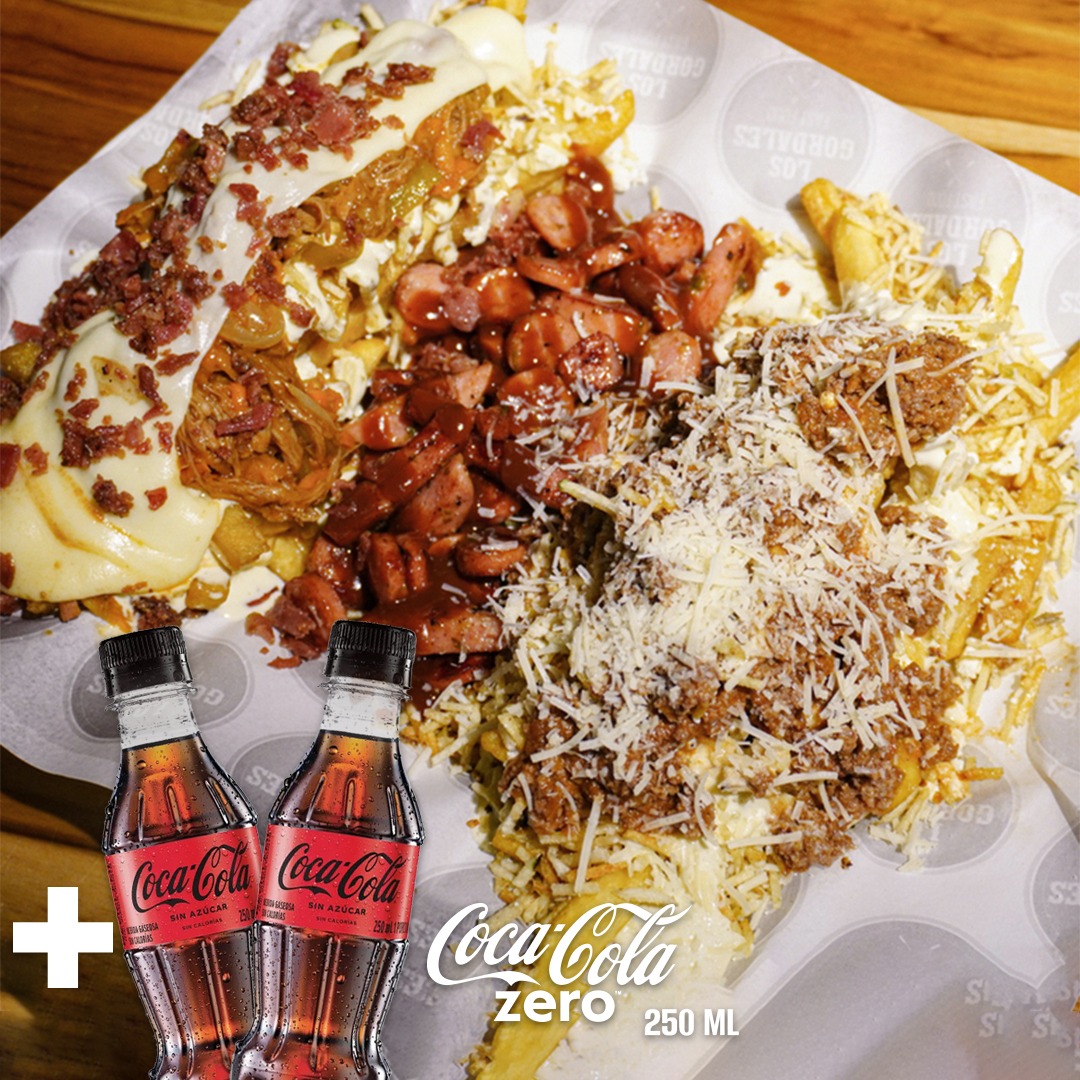 Papas a la francesa, queso costeño, chongo, salsa Gordales, carne en salsa boloñesa, queso parmesano, carne desmechada en base de panela, queso mozzarella, tocineta, mix de salchicha ranchera y salchichón cervecero con salsa BBQ de la casa.
