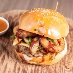 180 gr de carne de res, mermelada de tocineta en reducción de salsa teriyaki, queso cheddar americano, pepperoni americano, crocante de tortillales, salsa tartara de la casa, sobre un pan brioche sellado con mantequilla.