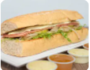 Pan francés finas hierbas, jamón, lechuga crespa, tomate milano, cebolla salteada, mozzarella y salsa Gordales, acompañado con papas a la francesa.