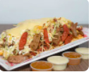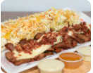 Pechuga en trocitos, lomito (res y cerdo), chorizo, butifarra, queso costeño, papa chongo, lechuga, queso gratinado, salsa Gordales y salsa de piña artesanal.